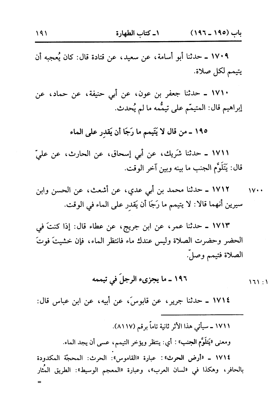 1712- حَدَّثَنَا مُحَمَّدُ بْنُ أَبِي عَدِيٍّ ، عَنْ أَشْعَثَ ، عَنِ الْحَسَنِ وَابْنِ سِيرِينَ أَنَّهُمَا قَالاَ : لا يَتَيَمَّمُ مَا رَجَا أَنْ يَقْدِرَ عَلَى الْمَاءِ فِي الْوَقْتِ.