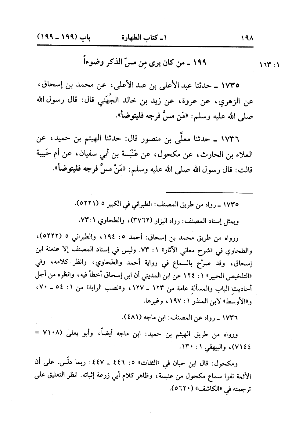 1736- حَدَّثَنَا مُعَلَّى بْنُ مَنْصُورٍ , قَالَ : حدَّثَنَا الْهَيْثُمَّ بْنُ حُمَيْدٍ ، عَنِ الْعَلاَءِ بْنِ الْحَارِثِ ، عَنْ مَكْحُولٍ ، عَنْ عَنْبَسَةَ بْنِ أَبِي سُفْيَانَ ، عَنْ أُمِّ حَبِيبَةَ ، قَالَتْ : قَالَ رَسُولُ اللهِ صَلَّى الله عَلَيْهِ وَسَلَّمَ : مَنْ مَسَّ فَرْجَهُ فَلْيَتَوَضَّأْ. (1/163).