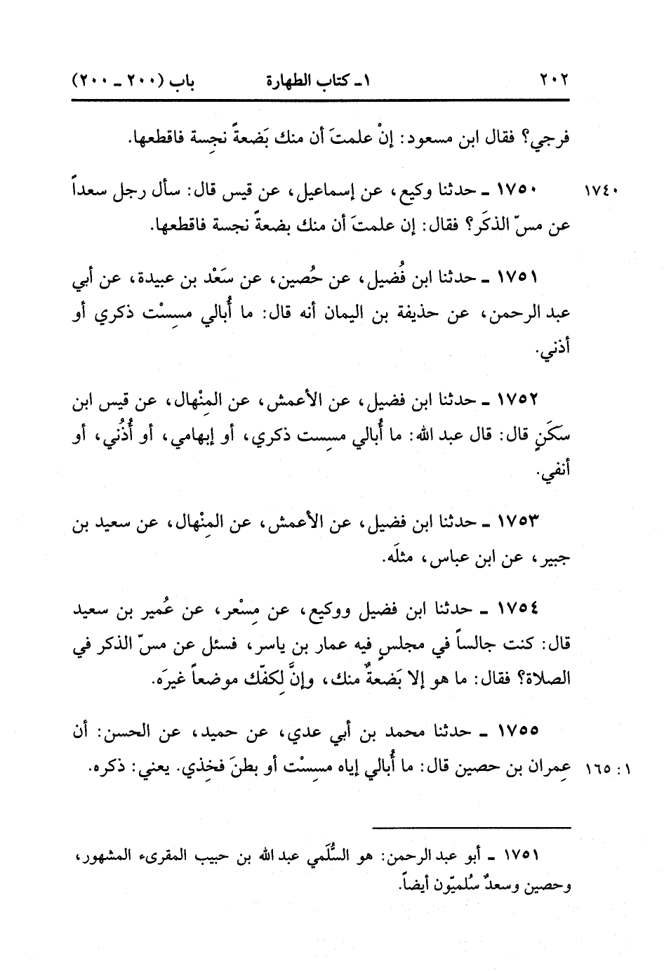 1751- حَدَّثَنَا ابْنُ فُضَيْلٍ ، عَنْ حُصَيْنٍ ، عَنْ سَعْدِ بْنِ عُبَيْدَةَ ، عَنْ أَبِي عَبْدِ الرَّحْمَنِ ، عَنْ حُذَيْفَةَ بْنِ الْيَمَانِ ، أَنَّهُ قَالَ : مَا أُبَالِي مَسِسْت ذَكَرِي أَوْ أُذُنِي.