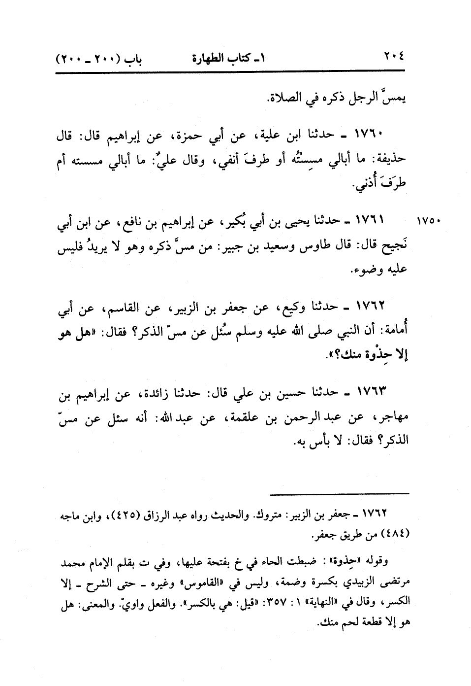 1763- حَدَّثَنَا حُسَيْنُ بْنُ عَلِيٍّ ، قَالَ : حَدَّثَنَا زَائِدَةُ ، عَنْ إبْرَاهِيمَ بْنِ مُهَاجِرٍ ، عَنْ عَبْدِ الرَّحْمَنِ بْنِ عَلْقَمَةَ ، عَنْ عَبْدِ اللهِ ؛ أَنَّهُ سُئِلَ عَنْ مَسِّ الذَّكَرِ ؟ فَقَالَ : لا بَأْسَ بِهِ. (1/165).