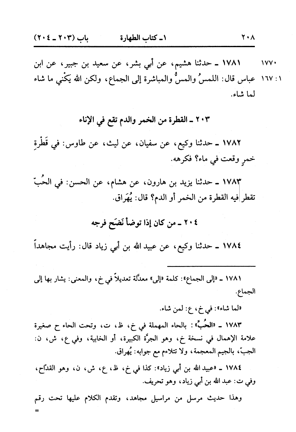 1784- حَدَّثَنَا وَكِيعٌ ، عَنْ عَبْيدِ اللهِ بْنِ أَبِي زِيَادٍ ، قَالَ : رَأَيْتُ مُجَاهِدًا يَتَوَضَّأُ فَنَضَحَ فَرْجَهُ ، وَذُكِرَ أَنَّ النَّبِيَّ صَلَّى الله عَلَيْهِ وَسَلَّمَ فَعَلَهُ. (1/167).
