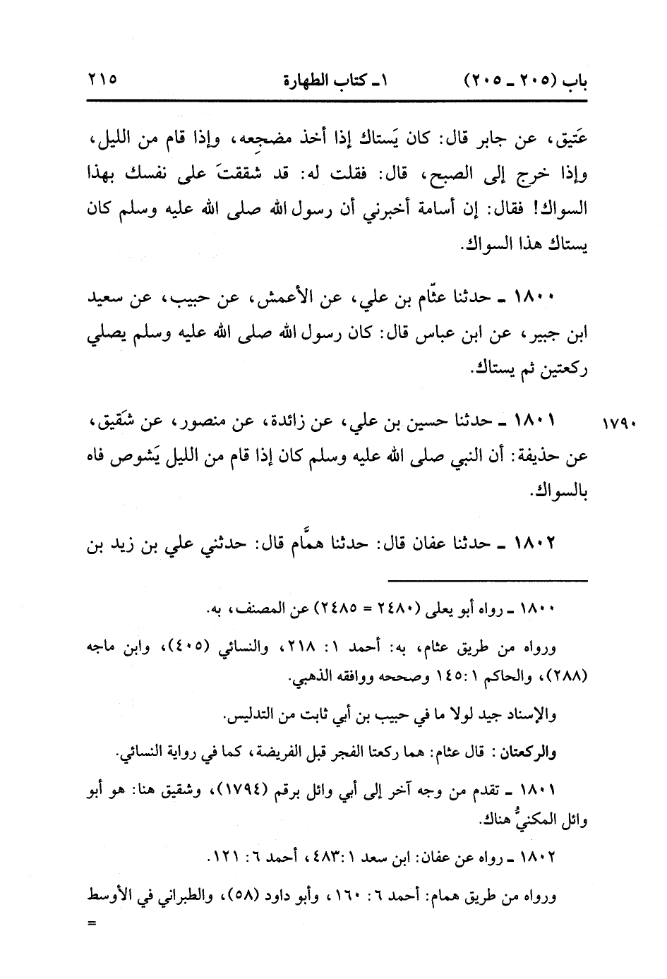 1802- حَدَّثَنَا عَفَّانُ , قَالَ : حدَّثَنَا هَمَّامٌ ، قَالَ : حَدَّثَنِي عَلِيُّ بْنُ زَيْدِ بْنِ جُدْعَانَ ، قَالَ حَدَّثَتْنِي أُمُّ مُحَمَّدٍ ، عَنْ عَائِشَةَ : أَنَّ النَّبِيَّ صَلَّى الله عَلَيْهِ وَسَلَّمَ كَانَ لا يَرْقُدُ لَيْلاً وَلا نَهَارًا فَيَسْتَيْقِظُ إِلاَّ تَسَوَّكَ قَبْلَ أَنْ يَتَوَضَّأَ. (1/169).