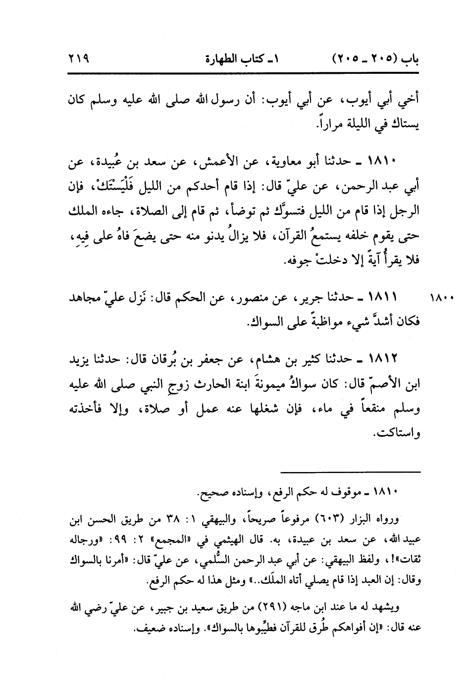1811- حَدَّثَنَا جَرِيرٌ ، عَنْ مَنْصُورٍ ، عَنِ الْحَكَمِ ، قَالَ : نَزَلَ عَلَيّ مُجَاهِد فَكَانَ أَشَدَّ شَيْءٍ مُوَاظَبَةً عَلَى السِّوَاكِ.