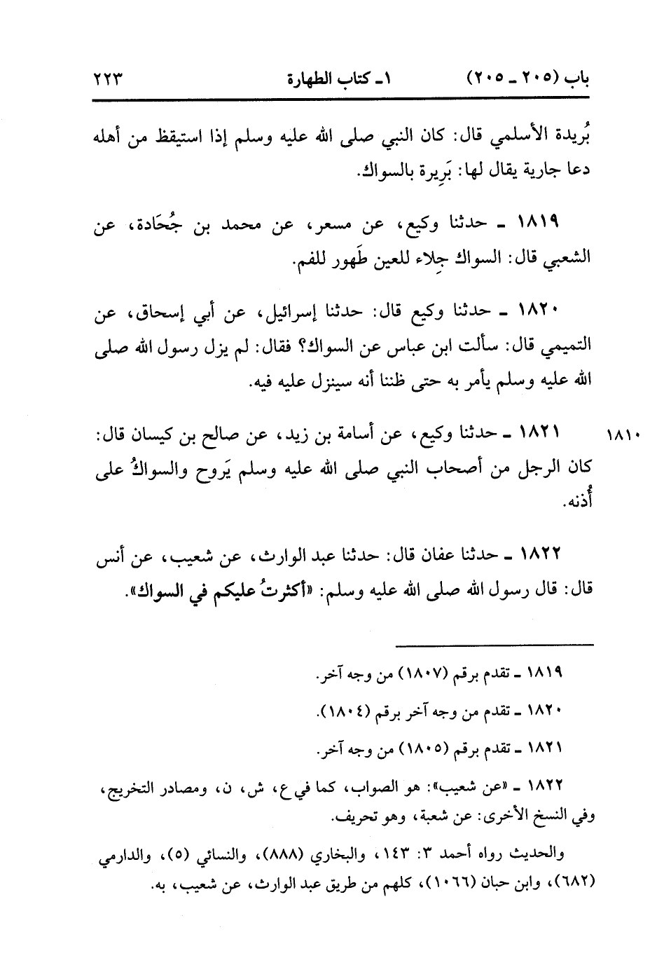 1822- حَدَّثَنَا عَفَّانُ , قَالَ : حدَّثَنَا عَبْدُ الْوَارِثِ ، عَنْ شُعَيْبٍ ، عَنْ أَنَسٍ ، قَالَ : قَالَ رَسُولُ اللهِ صَلَّى الله عَلَيْهِ وَسَلَّمَ : أَكْثَرْتُ عَلَيْكُمْ فِي السِّوَاكِ. (1/171).