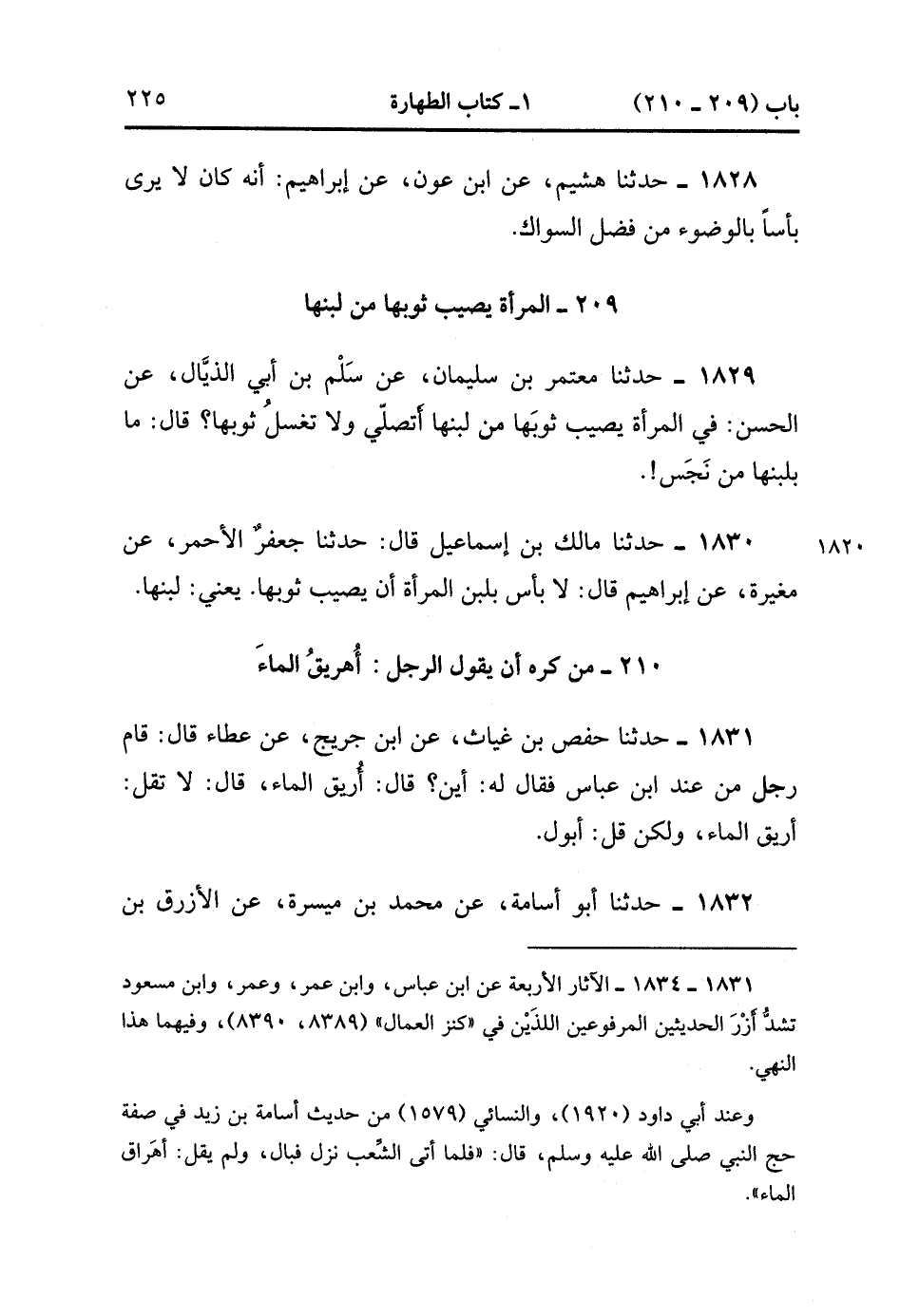 1832- حَدَّثَنَا أَبُو أُسَامَةَ ، عَنْ مُحَمَّدِ بْنِ مَيْسَرَةَ ، عَنِ الأَزْرَقِ بْنِ قَيْسٍ ، أَنَّهُ سَمِعَ ابْنَ عُمَرَ ؛ أَنَّهُ كَرِهَ أَنْ يَقُولَ : أَقُومُ أُهَرِيقَ الْمَاءَ. (1/172).