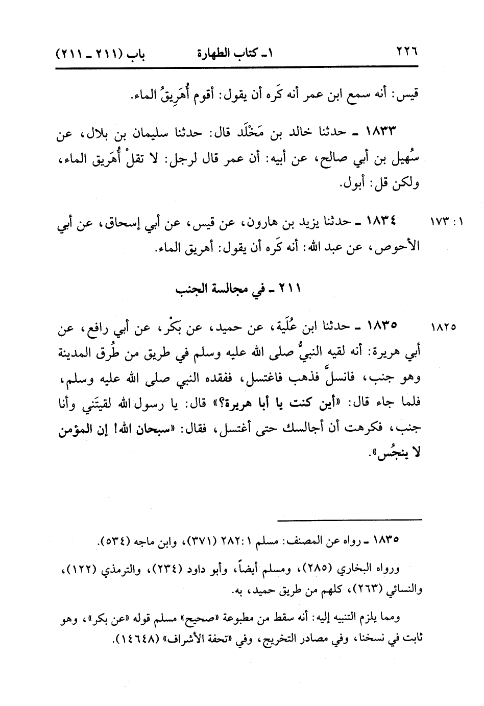 1835- حَدَّثَنَا ابْنُ عُلَيَّةَ ، عَنْ حُمَيْدٍ ، عَنْ بَكْرٍ ، عَنْ أَبِي رَافِعٍ ، عَنْ أَبِي هُرَيْرَةَ : أَنَّهُ لَقِيَهُ النَّبِيُّ صَلَّى الله عَلَيْهِ وَسَلَّمَ فِي طَرِيقٍ مِنْ طُرُقِ الْمَدِينَةِ وَهُوَ جُنُبٌ ، فَانْسَلَّ فَذَهَبَ فَاغْتَسَلَ ، فَفَقَدَهُ النَّبِيُّ صَلَّى الله عَلَيْهِ وَسَلَّمَ فَلَمَّا جَاءَ قَالَ : أَيْنَ كُنْت يَا أَبَا هُرَيْرَةَ ؟ قَالَ : يَا رَسُولَ اللهِ ، لَقِيتَنِي وَأَنَا جُنُبٌ فَكَرِهْتُ أَنْ أُجَالِسَك حَتَّى أَغْتَسِلَ ، فَقَالَ : سُبْحَانَ اللهِ ، إنَّ الْمُؤْمِنَ لا يَنْجُسُ. (1/173).