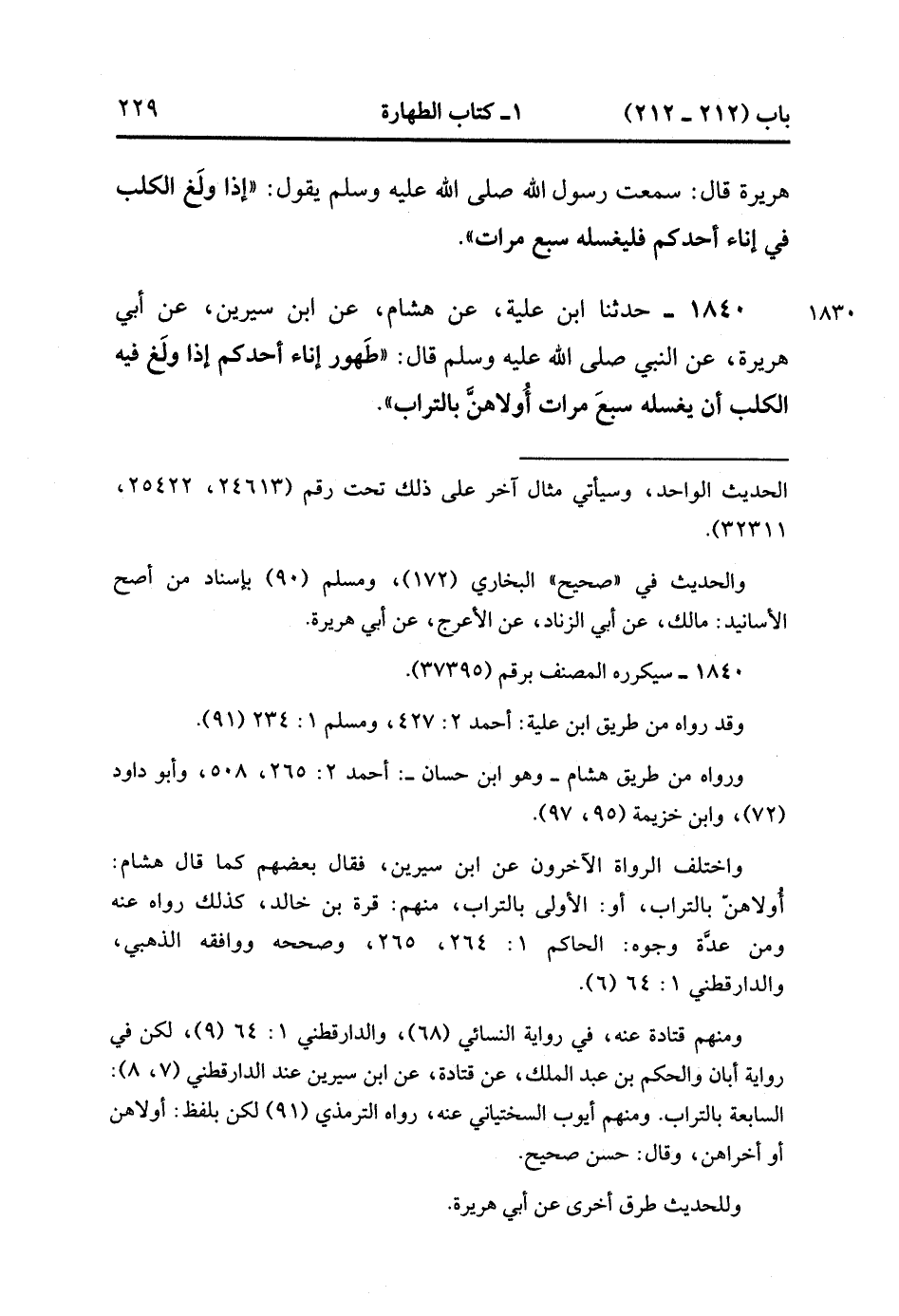 1840- حَدَّثَنَا ابْنُ عُلَيَّةَ ، عَنْ هِشَامٍ ، عَنِ ابْنِ سِيرِينَ ، عَنْ أَبِي هُرَيْرَةَ ، عَنِ النَّبِيِّ صَلَّى الله عَلَيْهِ وَسَلَّمَ ، قَالَ : طَهُورُ إنَاءِ أَحَدِكُمْ إذَا وَلَغَ فِيهِ الْكَلْبُ أَنْ يَغْسِلَهُ سَبْعَ مَرَّاتٍ أُولاَهُنَّ بِالتُّرَابِ. (1/173).