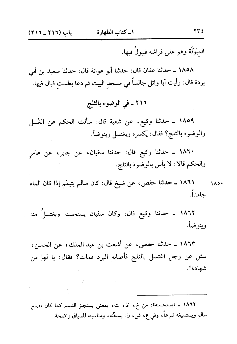 1859- حَدَّثَنَا وَكِيعٌ ، عَنْ شُعْبَةَ ، قَالَ : سَأَلْتُ الْحَكَمَ عَنِ الْغُسْلِ وَالْوُضُوءِ بِالثَّلْجِ ؟ فَقَالَ : يَكْسِرُهُ وَيَغْتَسِلُ وَيَتَوَضَّأُ.