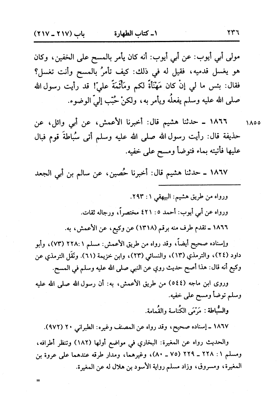 1866- حَدَّثَنَا هُشَيْمٌ ، قَالَ : أَخْبَرَنَا الأَعْمَش ، عَنْ أَبِي وَائِلٍ ، عَنْ حُذَيْفَةَ ، قَالَ : رَأَيْتُ رَسُولَ اللهِ صَلَّى الله عَلَيْهِ وَسَلَّمَ أَتَى سُبَاطَةَ قَوْمٍ فَبَالَ عَلَيْهَا فَأَتَيْتُهُ بِمَاءٍ فَتَوَضَّأَ وَمَسَحَ عَلَى خُفَّيْهِ. (1/176).