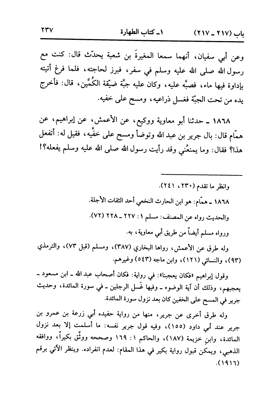 1868- حَدَّثَنَا أَبُو مُعَاوِيَةَ وَوَكِيعٍ ، عَنِ الأَعْمَشِ ، عَنْ إِبْرَاهِيمَ ، عَنْ هَمَّامٍ ، قَالَ : بَالَ جَرِيرُ بْنُ عَبْدِ اللهِ وَتَوَضَّأَ وَمَسَحَ عَلَى خُفَّيْهِ ، فَقِيلَ لَهُ : أَتَفْعَلُ هَذَا ؟ فَقَالَ : وَمَا يَمْنَعُنِي وَقَدْ رَأَيْتُ رَسُولَ اللهِ صَلَّى الله عَلَيْهِ وَسَلَّمَ يَفْعَلُهُ ؟ قَالَ إبْرَاهِيمُ : فَكَانَ يُعْجِبُنَا حَدِيثُ جَرِيرٍ لأَنَّ إسْلاَمَهُ كَانَ بَعْدَ نُزُولِ الْمَائِدَةِ. (1/176).
