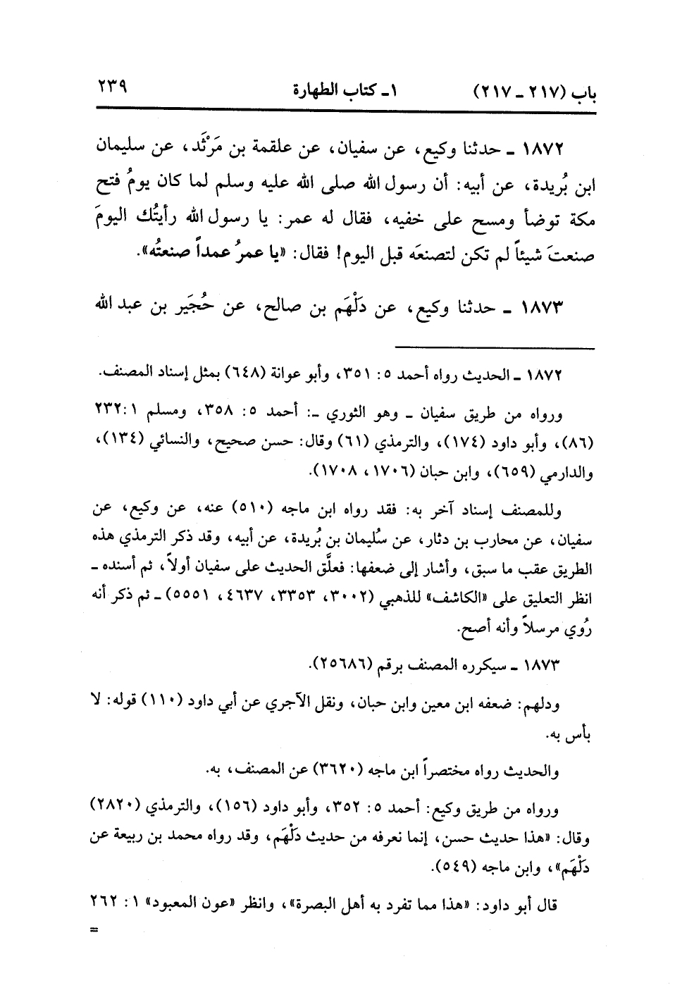 1872- حَدَّثَنَا وَكِيعٌ ، عَنْ سُفْيَانَ ، عَنْ عَلْقَمَةَ بْنِ مَرْثَدٍ ، عَنْ سُلَيْمَانَ بْنِ بُرَيْدَةَ ، عَنْ أَبِيهِ : أَنَّ رَسُولَ اللهِ صَلَّى الله عَلَيْهِ وَسَلَّمَ لَمَّا كَانَ يَوْمُ فَتْحِ مَكَّةَ تَوَضَّأَ وَمَسَحَ عَلَى خُفَّيْهِ ، فَقَالَ لَهُ عُمَرُ : يَا رَسُولَ اللهِ ، رَأَيْتُك الْيَوْمَ صَنَعْتَ شَيْئًا لَمْ تَكُنْ لِتَصْنَعَهُ قَبْلَ الْيَوْمِ ، فَقَالَ : يَا عُمَرُ ، عَمْدًا صَنَعْتُهُ. (1/177).