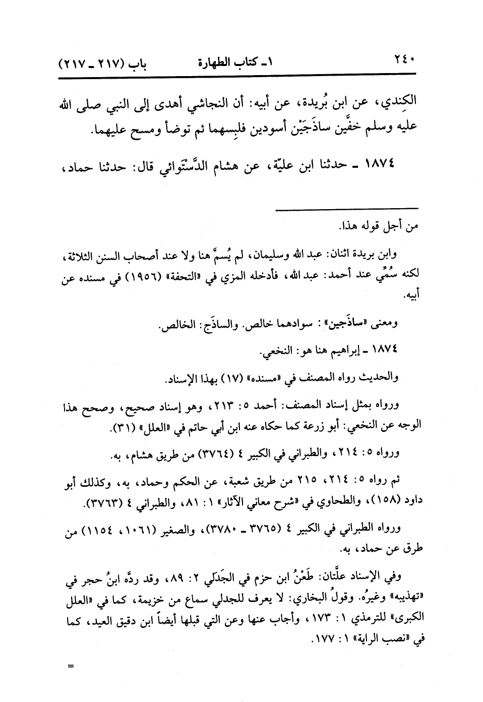1873- حَدَّثَنَا وَكِيعٌ ، عَنْ دَلْهَمِ بْنِ صَالِحٍ ، عَنْ حُجَيْرِ بْنِ عَبْدِ اللهِ الْكِنْدِيِّ ، عَنِ ابْنِ بُرَيْدَةَ ، عَنْ أَبِيهِ : أَنَّ النَّجَاشِيَّ أَهْدَى إلَى النَّبِيِّ صَلَّى الله عَلَيْهِ وَسَلَّمَ خُفَّيْنِ سَاذَجَيْنِ أَسْوَدَيْنِ فَلَبِسَهُمَا ثُمَّ تَوَضَّأَ وَمَسَحَ عَلَيْهِمَا. (1/177).