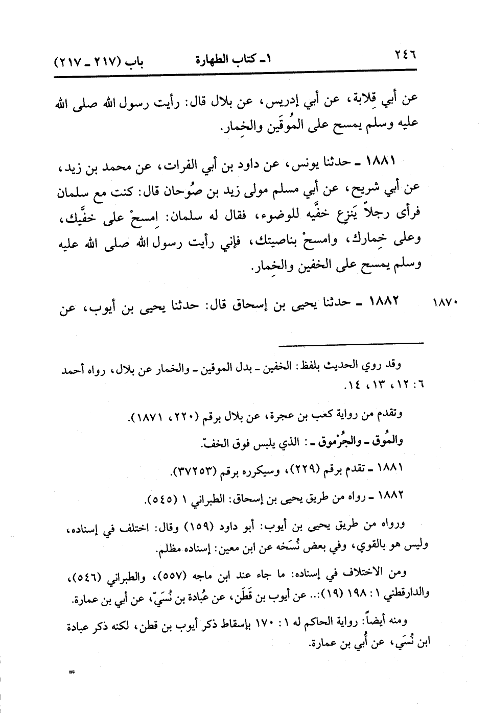 1881- حَدَّثَنَا يُونُسُ ، عَنْ دَاوُدَ بْنِ أَبِي الْفُرَاتِ ، عَنْ مُحَمَّدِ بْنِ زَيْدٍ ، عَنْ أَبِي شُرَيْحٍ ، عَنْ أَبِي مُسْلِمٍ مَوْلَى زَيْدِ بْنِ صُوحَانَ ، قَالَ : كُنْتُ مَعَ سَلْمَانَ فَرَأَى رَجُلاً يَنْزِعُ خُفَّيْهِ لِلْوُضُوءِ ، فَقَالَ لَهُ سَلْمَانُ : امْسَحْ عَلَى خُفَّيْك وَعَلَى خِمَارِكَ وَامْسَحْ بِنَاصِيَتِكَ فَإِنِّي رَأَيْت رَسُولَ اللهِ صَلَّى الله عَلَيْهِ وَسَلَّمَ يَمْسَحُ عَلَى الْخُفَّيْنِ وَالْخِمَارِ. (1/178).