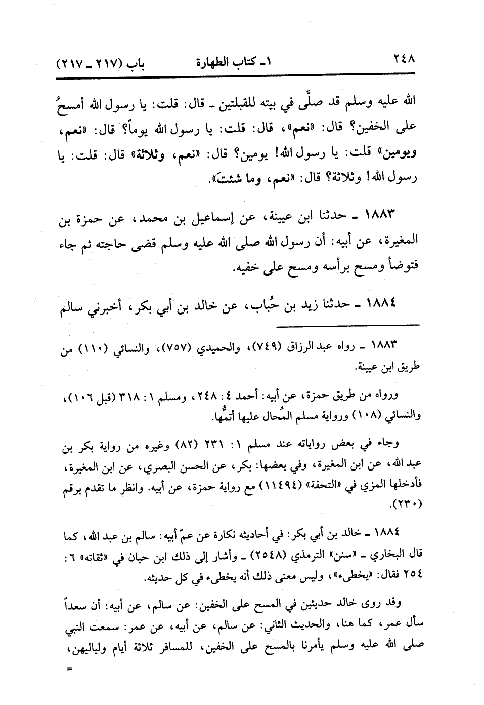 1883- حَدَّثَنَا ابْنُ عُيَيْنَةَ ، عَنْ إسْمَاعِيلَ بْنِ مُحَمَّدٍ ، عَنْ حَمْزَةَ بْنِ الْمُغِيرَةِ ، عَنْ أَبِيهِ : أَنَّ رَسُولَ اللهِ صَلَّى الله عَلَيْهِ وَسَلَّمَ قَضَى حَاجَتَهُ ثُمَّ جَاءَ فَتَوَضَّأَ وَمَسَحَ بِرَأْسِهِ وَمَسَحَ عَلَى خُفَّيْهِ. (1/178).