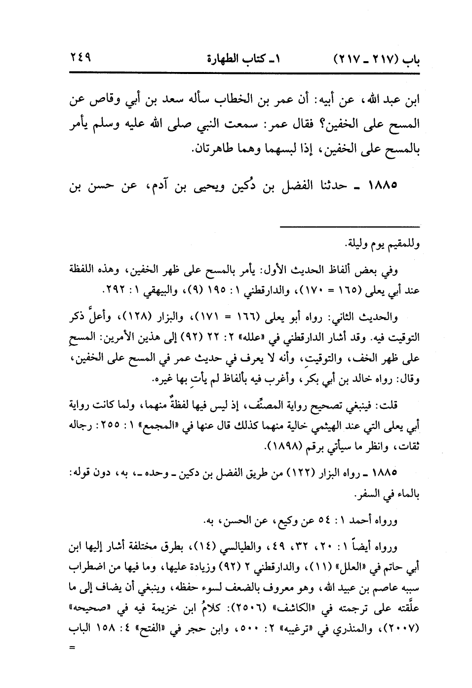1885- حَدَّثَنَا الْفَضْلُ بْنُ دُكَيْنٍ وَيَحْيَى بْنُ آدَمَ ، عَنْ حَسَنِ بْنِ صَالِحٍ ، عَنْ عَاصِمٍ ، عَنْ سَالِمٍ ، عَنِ ابْنِ عُمَرَ ، عَنْ عُمَرَ ، قَالَ : رَأَيْتُ رَسُولَ اللهِ صَلَّى الله عَلَيْهِ وَسَلَّمَ يَمْسَحُ عَلَى الْخُفَّيْنِ بِالْمَاءِ فِي السَّفَرِ. (1/178).