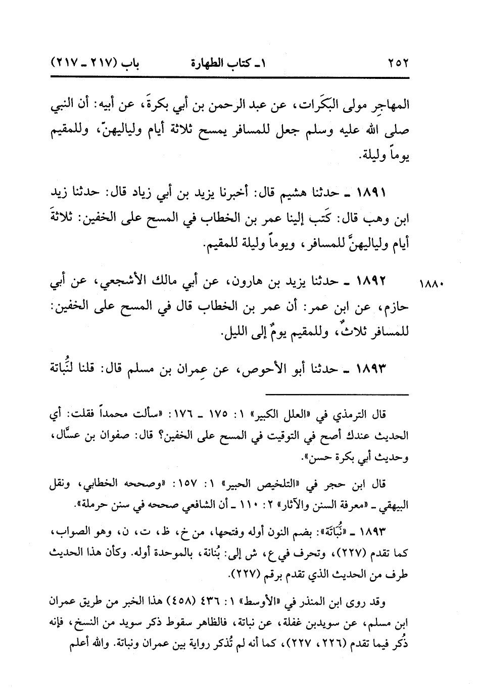 1892- حَدَّثَنَا يَزِيدُ بْنُ هَارُونَ ، عَنْ أَبِي مَالِكٍ الأَشْجَعِيِّ ، عَنْ أَبِي حَازِمٍ ، عَنِ ابْنِ عُمَرَ ، أَنَّ عُمَرَ بْنَ الْخَطَّابِ قَالَ فِي الْمَسْحِ عَلَى الْخُفَّيْنِ : لِلْمُسَافِرِ ثَلاَثٌ وَلِلْمُقِيمِ يَوْمٌ إلَى اللَّيْلِ. (1/179).