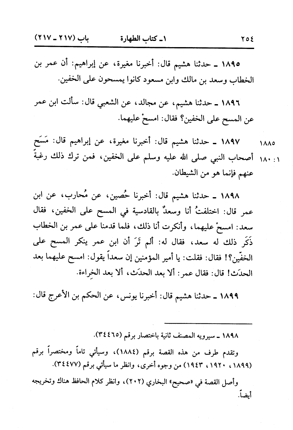 1899- حَدَّثَنَا هُشَيْمٌ ، قَالَ : أَخْبَرَنَا يُونُسُ ، عَنِ الْحَكَمِ بْنِ الأَعْرَجِ ، قَالَ : سَأَلْتُ ابْنَ عُمَرَ عَنِ الْمَسْحِ عَلَى الْخُفَّيْنِ ، فَقَالَ : اخْتَلَفْتُ أَنَا وَسَعْدٌ فِي ذَلِكَ وَنَحْنُ بِجَلُولاَءَ ، فَقَالَ سَعْدٌ : امْسَحْ عَلَيْهِمَا فَأَنْكَرْتُ ذَلِكَ ، فَلَمَّا قَدِمْنَا عَلَى عُمَرَ ذَكَرْتُ لَهُ ذَلِكَ ، قَالَ : فَقَالَ : يَا أَمِيرَ الْمُؤْمِنِينَ ، إِنَّهُ يَقُولُ : يمسح عَلَيْهِمَا بَعْدَ الْحَدَثِ ، فَقَالَ عُمَرُ : أَلا بَعْدَ الْخِرَاءَةِ ، أَلا بَعْدَ الْحَدَثِ. (1/180).