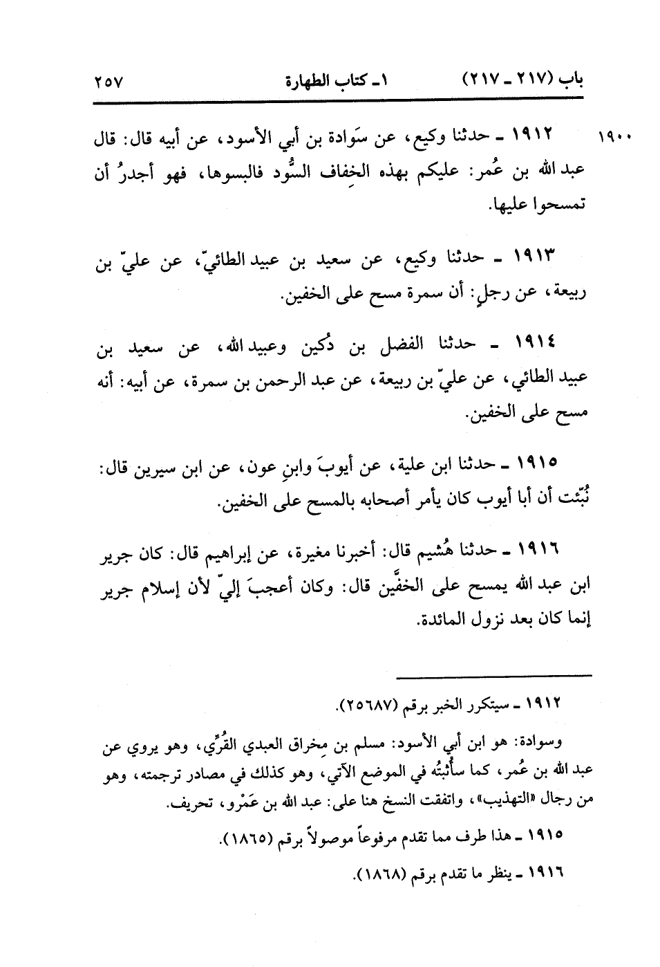 1912- حَدَّثَنَا وَكِيعٌ ، عَنْ سَوَادَةَ بْنِ أَبِي الأَسْوَدِ ، عَنْ أَبِيهِ قَالَ : قَالَ عَبْدُ اللهِ بْنِ عُمَر : عَلَيْكُمْ بِهَذِهِ الْخِفَافِ السُّوَدِ فَالْبِسُوهَا ، فَهُوَ أَجْدَرُ أَنْ تَمْسَحُوا عَلَيْهَا.
