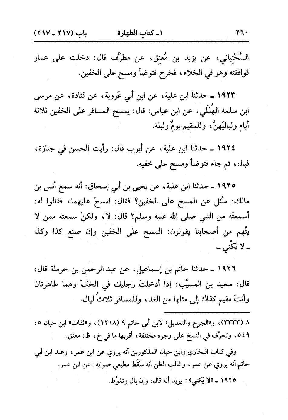 1926- حَدَّثَنَا حَاتِمُ بْنُ إِسْمَاعِيلَ ، عَنْ عَبْدِ الرَّحْمَنِ بْنِ حَرْمَلَةَ قَالَ : قَالَ سَعِيدُ بْنُ الْمُسَيَّبِ : إِذَا أَدْخَلْتَ رِجْلَيْكَ فِي الْخُفِّ وَهُمَا طَاهِرَتَانِ وَأَنْتَ مُقِيمٌ كَفَاكَ إِلَى مِثْلِهَا مِنَ الْغَدِ ، وَلِلْمُسَافِرِ ثَلاَثُ لَيَالٍ. (1/182).