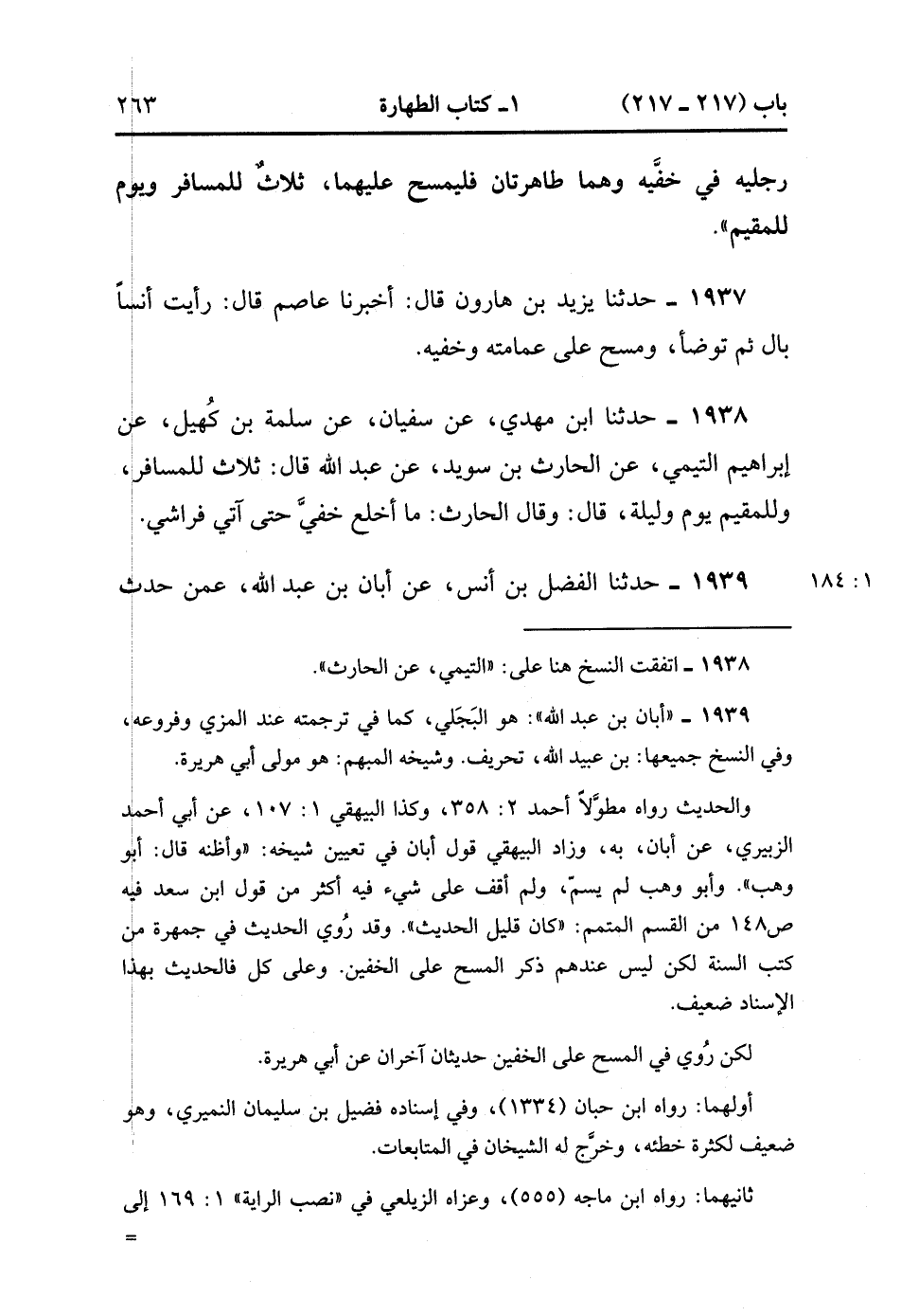 1939- حَدَّثَنَا الْفَضْلُ بْنُ أَنَسٍ ، عَنْ أَبَانَ بْنِ عَبْدِ اللهِ ، عَمَّنْ حَدَّثَ عَنْ أَبِي هُرَيْرَةَ : أَنَّ النَّبِيَّ صَلَّى اللَّهُ عَلَيْهِ وَسَلَّمَ مَسَحَ عَلَى الْخُفَّيْنِ. (1/184).