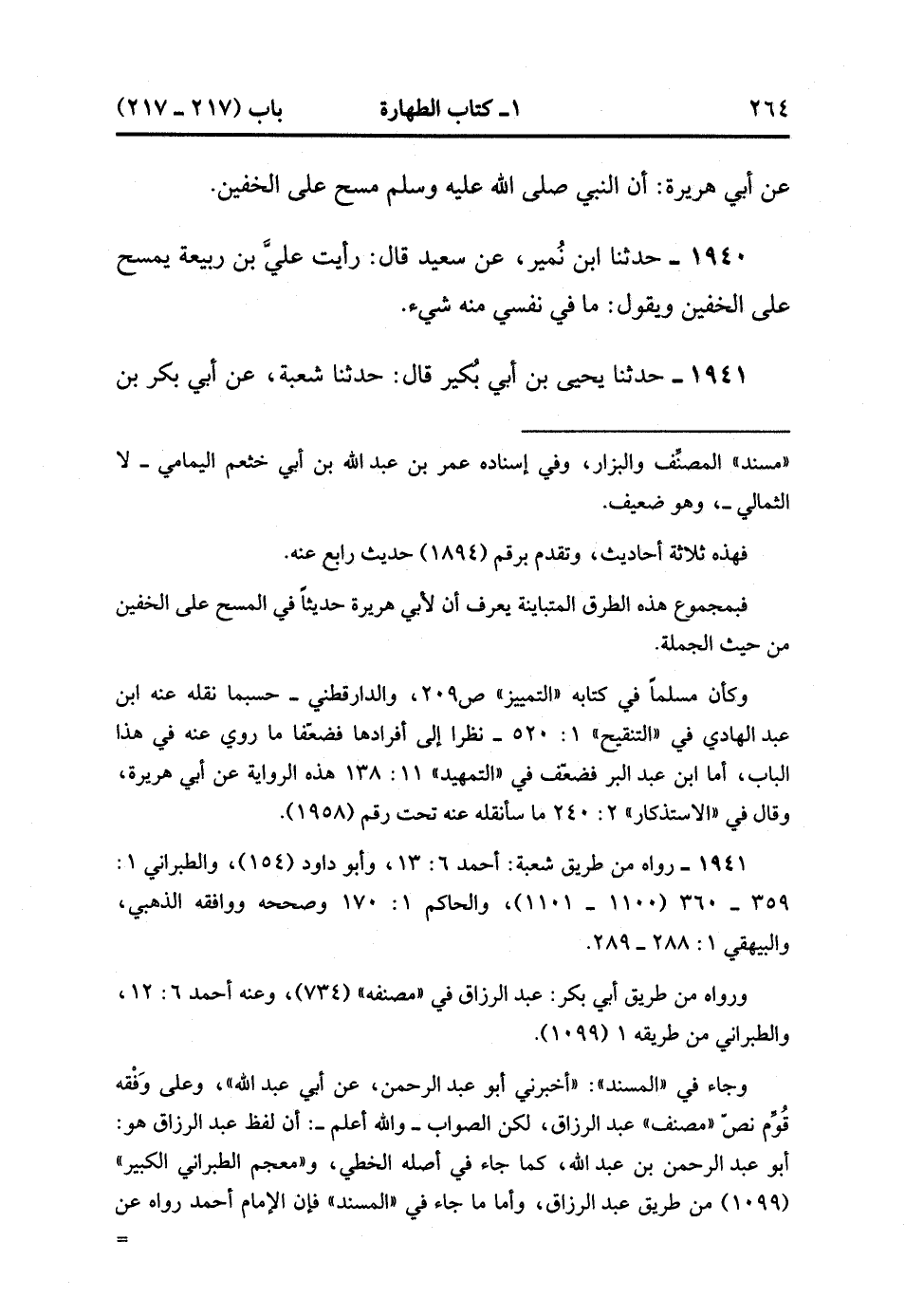 1941- حَدَّثَنَا يَحْيَى بْنُ أَبِي بُكَيْرٍ ، قَالَ : حَدَّثَنَا شُعْبَةُ ، عَنْ أَبِي بَكْرِ بْنِ حَفْصٍ ، عَنْ أَبِي عَبْدِ اللهِ مَوْلَى التَّيْمِ بْنِ مُرَّةَ ، عَنْ أَبِي عَبْدِ الرَّحْمَنِ ، قَالَ : كُنْتُ جَالِسًا مَعَ عَبْدِ الرَّحْمَنِ بْنِ عَوْفٍ ، فَمَرَّ بِنَا بِلاَلٌ فَسَأَلْنَاهُ عَنِ الْمَسْحِ عَلَى الْخُفَّيْنِ ؟ فَقَالَ : كَانَ رَسُولُ اللهِ صَلَّى اللَّهُ عَلَيْهِ وَسَلَّمَ يَقْضِي حَاجَتَهُ ثُمَّ يَخْرُجُ فَنَأْتِيهِ بِالْمَاءِ ، فَيَتَوَضَّأُ وَيَمْسَحُ عَلَى الْمُوقَيْنِ وَالْعِمَامَةِ. (1/184).