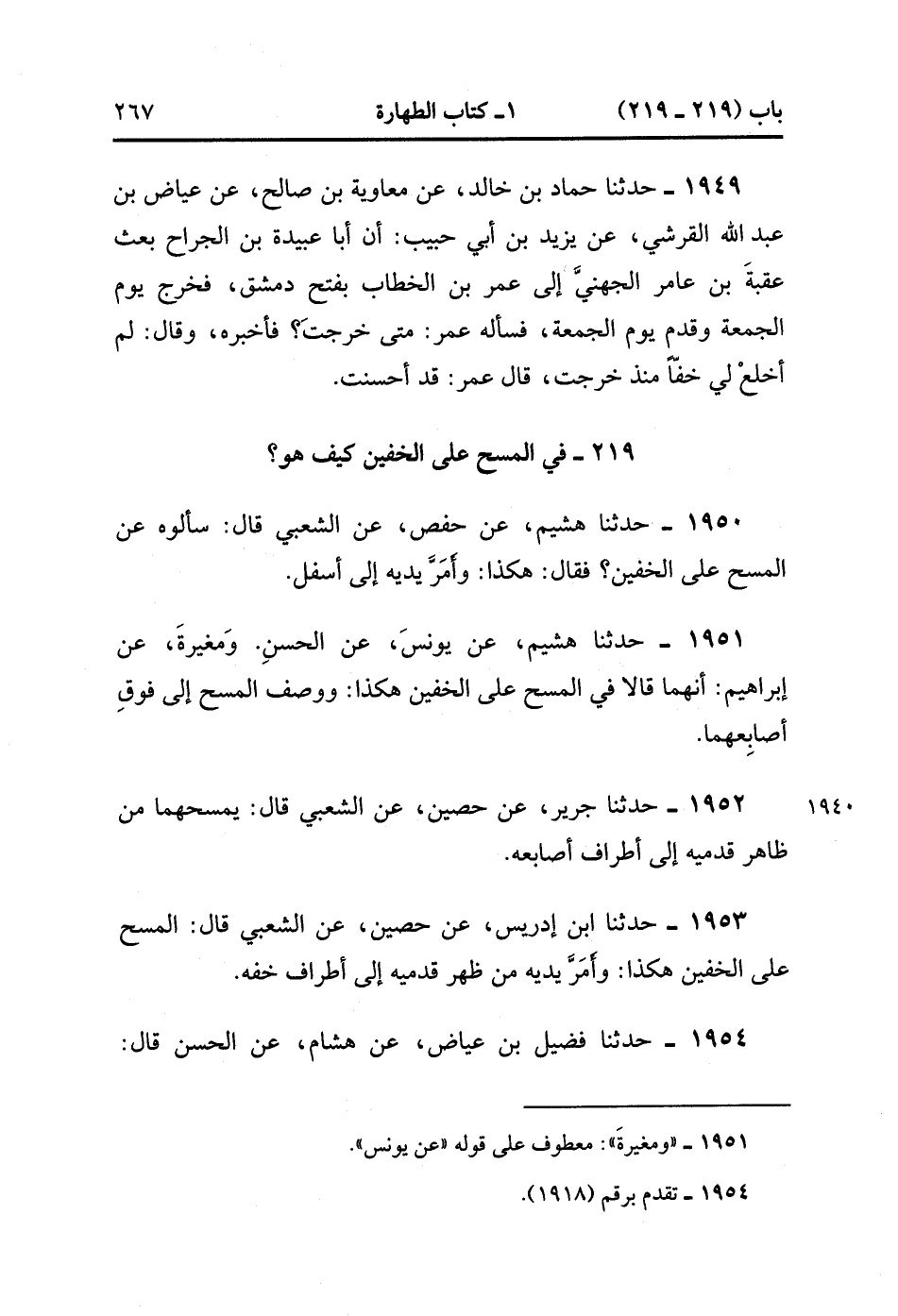 1950- حَدَّثَنَا هُشَيْمٌ ، عَنْ حَفْصٍ ، عَنِ الشَّعْبِيِّ قَالَ : سَأَلُوهُ عَنِ الْمَسْحِ عَلَى الْخُفَّيْنِ ؟ فَقَالَ : هَكَذَا وَأَمَرَّ يَدَيْهِ إِلَى أَسْفَلَ.