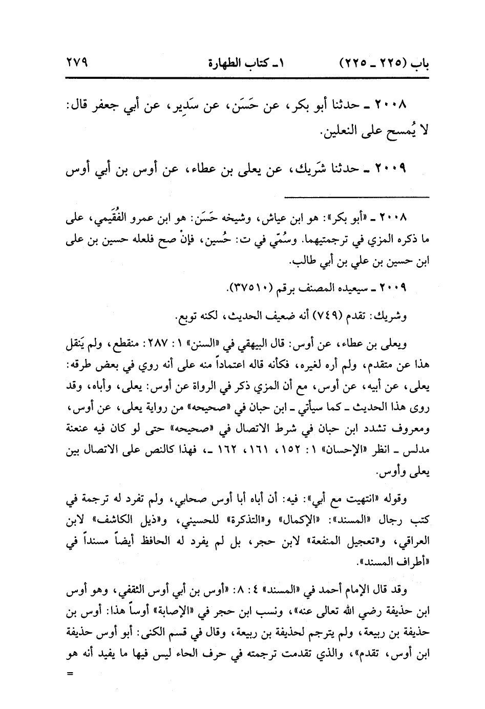 2009- حَدَّثَنَا شَرِيكٌ ، عَنْ يَعْلَى بْنٍ عَطَاءٍ ، عَنْ أَوْسِ بْنِ أَبِي أَوْسٍ قَالَ : انْتَهَيْتُ مَعَ أَبِي إِلَى مَاءٍ مِنْ مِيَاهِ الأَعْرَابِ فَتَوَضَّأَ وَمَسَحَ عَلَى نَعْلَيْهِ ، فَقُلْتُ لَهُ ؟ فَقَالَ : رَأَيْتُ رَسُولَ اللهِ صَلَّى اللَّهُ عَلَيْهِ وَسَلَّمَ فَعَلَهُ. (1/190).