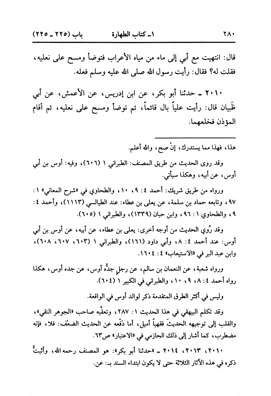 2010- حَدَّثَنَا أَبُو بَكْرٍ ، عَنِ ابْنِ إِدْرِيسَ ، عَنِ الأَعْمَشِ ، عَنْ أَبِي ظَبْيَانَ ، قَالَ : رَأَيْتُ عَلِيًّا بَالَ قَائِمًا ثُمَّ تَوَضَّأَ وَمَسَحَ عَلَى نَعْلَيْهِ ثُمَّ أَقَامَ الْمُؤَذِّنُ فَخَلَعَهُمَا. (1/190).