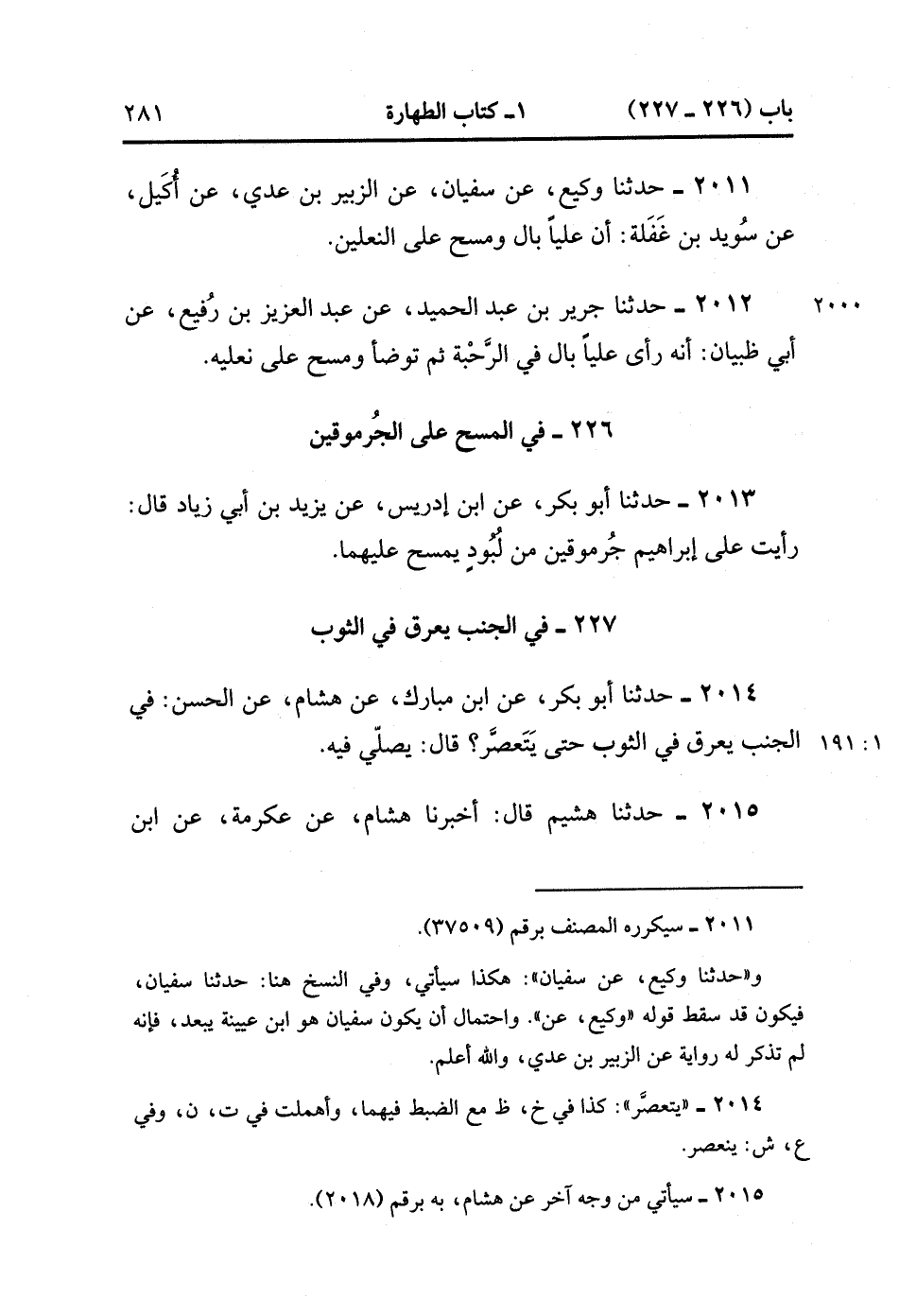 2011- حَدَّثَنَا وَكِيعٌ ، عَنْ سُفْيَانَ ، عَنِ الزُّبَيْرِ بْنِ عَدِيٍّ ، عَنْ أُكَيْلٍ ، عَنْ سُوَيْدِ بْنِ غَفَلَةَ : أَنَّ عَلِيًّا بَالَ وَمَسَحَ عَلَى النَّعْلَيْنِ.