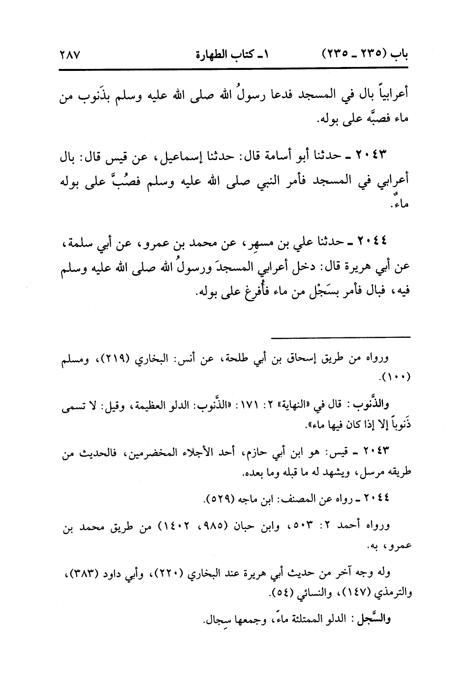2044- حَدَّثَنَا عَلِيُّ بْنُ مُسْهِرٍ ، عَنْ مُحَمَّدِ بْنِ عَمْرٍو ، عَنْ أَبِي سَلَمَةَ ، عَنْ أَبِي هُرَيْرَةَ قَالَ : دَخَلَ أَعْرَابِيٌّ الْمَسْجِدَ وَرَسُولُ اللهِ صَلَّى اللَّهُ عَلَيْهِ وَسَلَّمَ فِيهِ ، فَبَالَ فَأَمَرَ بِسَجْلٍ مِنْ مَاءٍ فَأَفْرَغَ عَلَى بَوْلِهِ. (1/193).