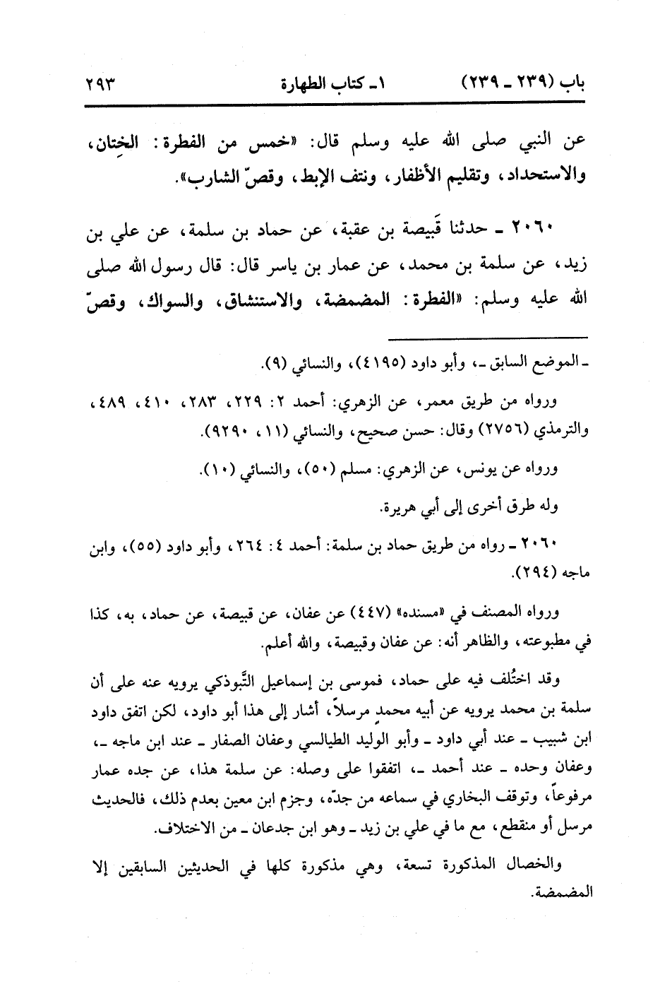 2060- حَدَّثَنَا قَبِيصَةُ بْنُ عُقْبَةَ ، عَنْ حَمَّادِ بْنِ سَلَمَةَ ، عَنْ عَلِيِّ بْنِ زَيْدٍ ، عَنْ سَلَمَةَ بْنَ مُحَمَّدٍ ، عَنْ عَمَّارِ بْنِ يَاسِرٍ قَالَ : قَالَ رَسُولُ اللهِ صَلَّى اللَّهُ عَلَيْهِ وَسَلَّمَ : الْفِطْرَةُ : الْمَضْمَضَةُ ، وَالِاسْتِنْشَاقُ ، وَالسِّوَاكُ ، وَقَصُّ الشَّارِبِ ، وَنَتْفُ الإِبِطِ ، وَغَسْلُ الْبَرَاجِمِ ، وَتَقْلِيمُ الأَظْفَارِ ، وَالِانْتِضَاحُ بِالْمَاءِ ، وَالْخِتَانُ. (1/195).