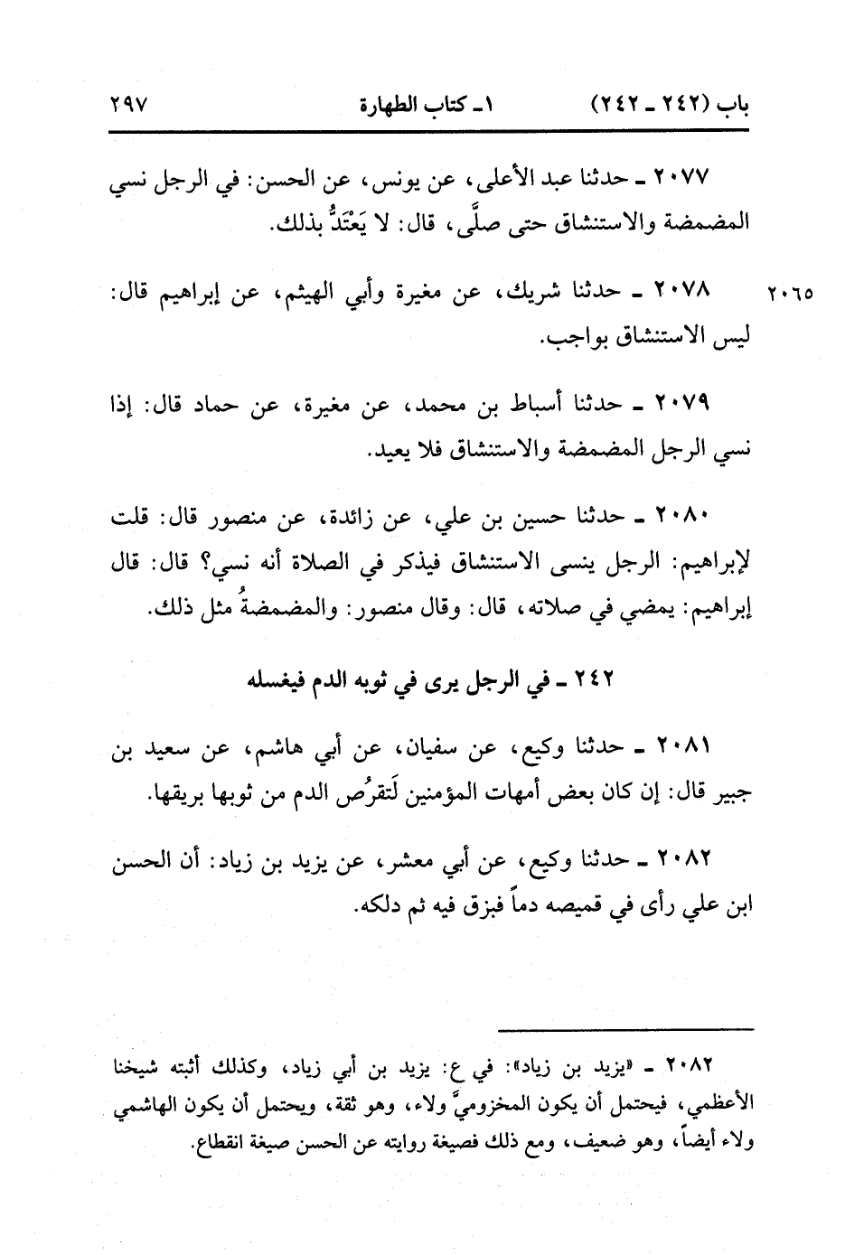 2080- حَدَّثَنَا حُسَينُ بْنُ عَلِيٍّ ، عَنْ زَائِدَةَ ، عَنْ مَنْصُورٍ ، قَالَ : قُلْتُ لإِبْرَاهِيمَ : الرَّجُلُ يَنْسَى الاسْتِنْشَاقَ فَيَذْكُرُ فِي الصَّلاَةِ أَنَّهُ نَسِيَ ؟ قَالَ : قَالَ إِبْرَاهِيمُ : يَمْضِي فِي صَلاَتِهِ ، قَالَ : وَقَالَ مَنْصُورٌ : وَالْمَضْمَضَةُ مِثْلُ ذَلِكَ.