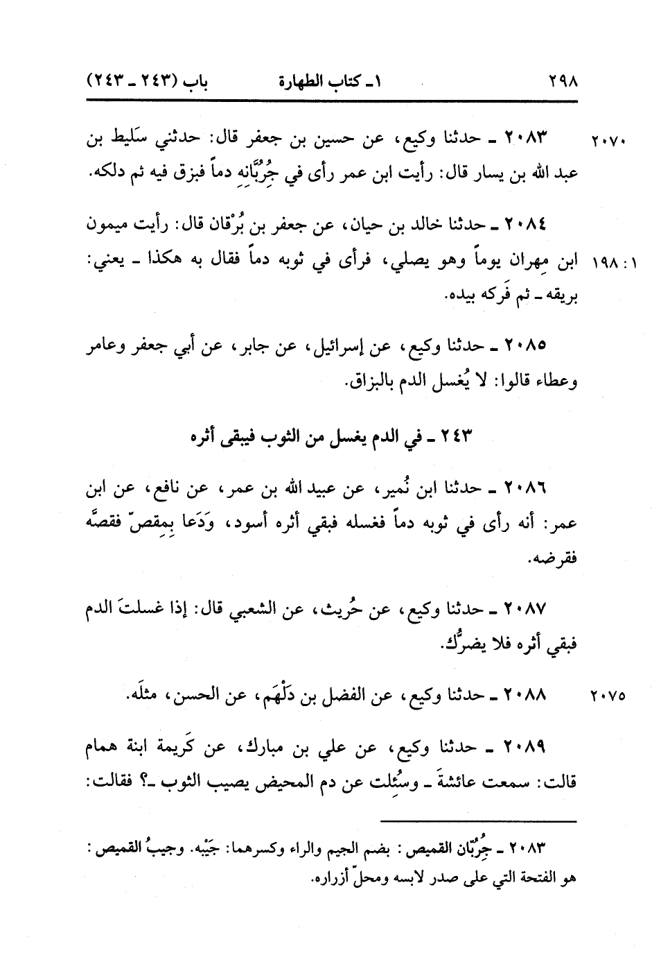 2089- حَدَّثَنَا وَكِيعٌ ، عَنْ عَلِيِّ بْنِ مُبَارَكٍ ، عَنْ كَرِيمَةَ ابْنَةِ هَمَّامٍ ، قَالَتْ : سَمِعْتُ عَائِشَةَ - وَسُئِلَتْ عَنْ دَمِ الْمَحِيضِ يُصِيبُ الثَّوْبَ - ؟ فَقَالَتْ : اغْسِلِيهِ ، فَقَالَتْ : غَسَلْتُهُ فَلَمْ يَذْهَبْ أَثَرُهُ ، فَقَالَتْ : اغْسِلِيهِ فَإِنَّ الْمَاءَ طَهُورٌ. (1/198).