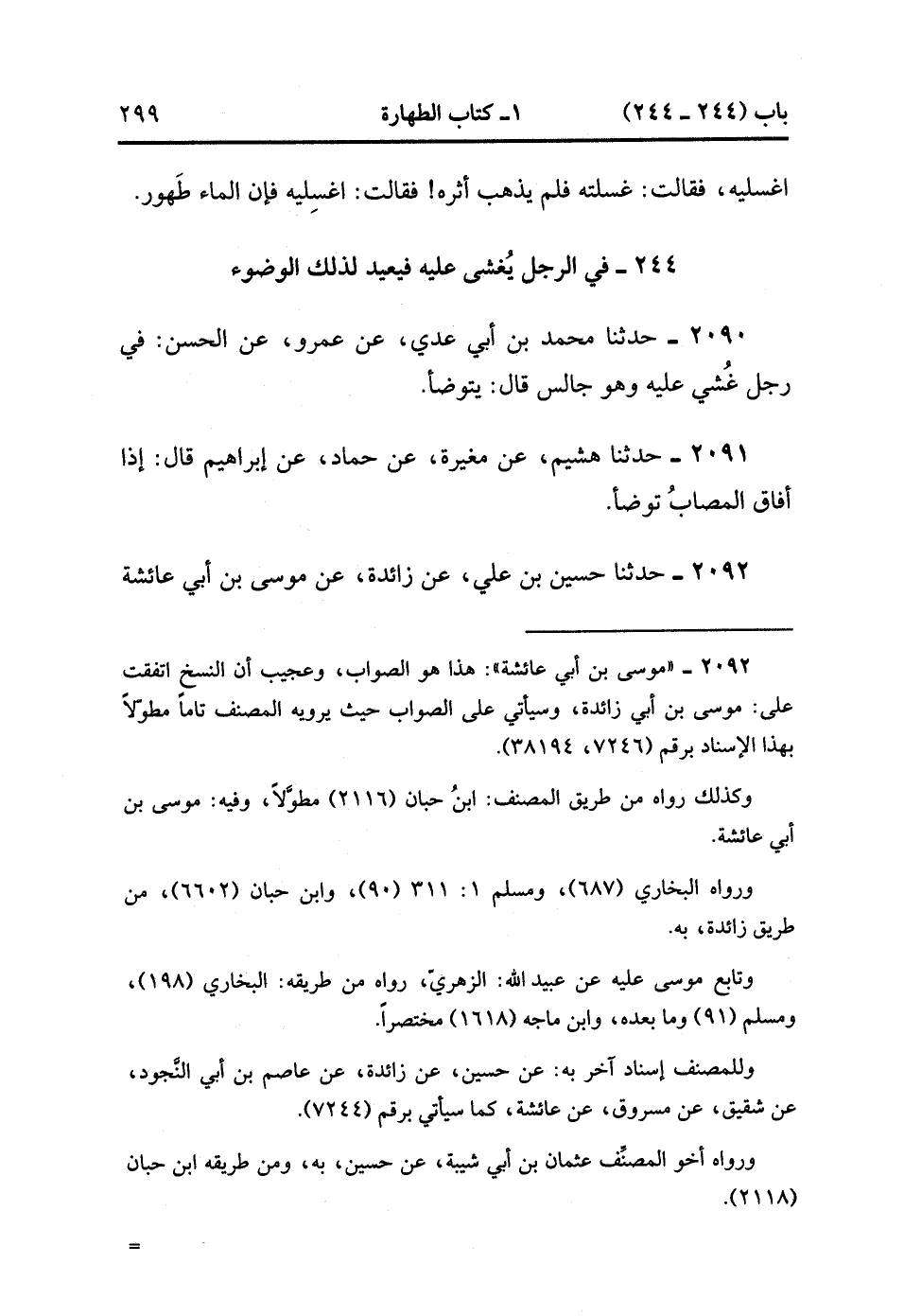 2092- حَدَّثَنَا حُسَيْنُ بْنُ عَلِيٍّ ، عَنْ زَائِدَةَ ، عَنْ مُوسَى بْنِ أَبِي عَائِشَةَ ، قَالَ : حَدَّثَنِي عُبَيْدُ اللهِ بْنِ عَبْدِ اللهِ بْنِ عُتْبَةَ ، قَالَ : أَتَيْتُ عَائِشَةَ ، فَقُلْتُ : حَدِّثِينِي عَنْ مَرَضِ رَسُولِ اللهِ صَلَّى اللَّهُ عَلَيْهِ وَسَلَّمَ ، فَقَالَتْ : نَعَمْ ، مَرِضَ رَسُولُ اللهِ صَلَّى اللَّهُ عَلَيْهِ وَسَلَّمَ فَثَقُلَ فَأُغْمِيَ عَلَيْهِ فَأَفَاقَ فَقَالَ : ضَعُوا لِي مَاءً فِي الْمِخْضَبِ ، قَالَتْ : فَفَعَلْنَا ، قَالَتْ : فَاغْتَسَلَ ، فَذَهَبَ لِينُوءَ فَأُغْمِيَ عَلَيْهِ ، ثُمَّ أَفَاقَ فَقَالَ : ضَعُوا لِي مَاءً فِي الْمِخْضَبِ ، قَالَتْ : فَفَعَلْنَا ، قَالَتْ : فَاغْتَسَلَ فَذَهَبَ لِينُوءَ فَأُغْمِيَ عَلَيْهِ ، ثُمَّ أَفَاقَ فَقَالَ : ضَعُوا لِي مَاءً فِي الْمِخْضَبِ ، فَاغْتَسَلَ حَتَّى فَعَلَهُ مِرَارًا. (1/198).