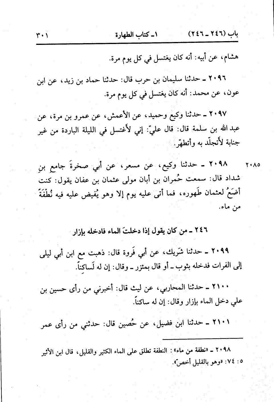 2098- حَدَّثَنَا وَكِيعٌ ، عَنْ مِسْعَرٍ ، عَنْ أَبِي صَخْرَةَ جَامِعِ بْنِ شَدَّادٍ ، قَالَ : سَمِعْتُ حُمْرَانَ بْنَ أَبَانَ ، مَوْلَى عُثْمَانَ بْنِ عَفَّانَ يَقُولُ : كُنْتُ أَضَعُ لِعُثْمَانَ طَهُورَهُ ، فَمَا أَتَى عَلَيْهِ يَوْمٌ إِلاَّ وَهُوَ يُفِيضُ عَلَيْهِ فِيهِ نُطْفَةً مِنْ مَاءٍ.