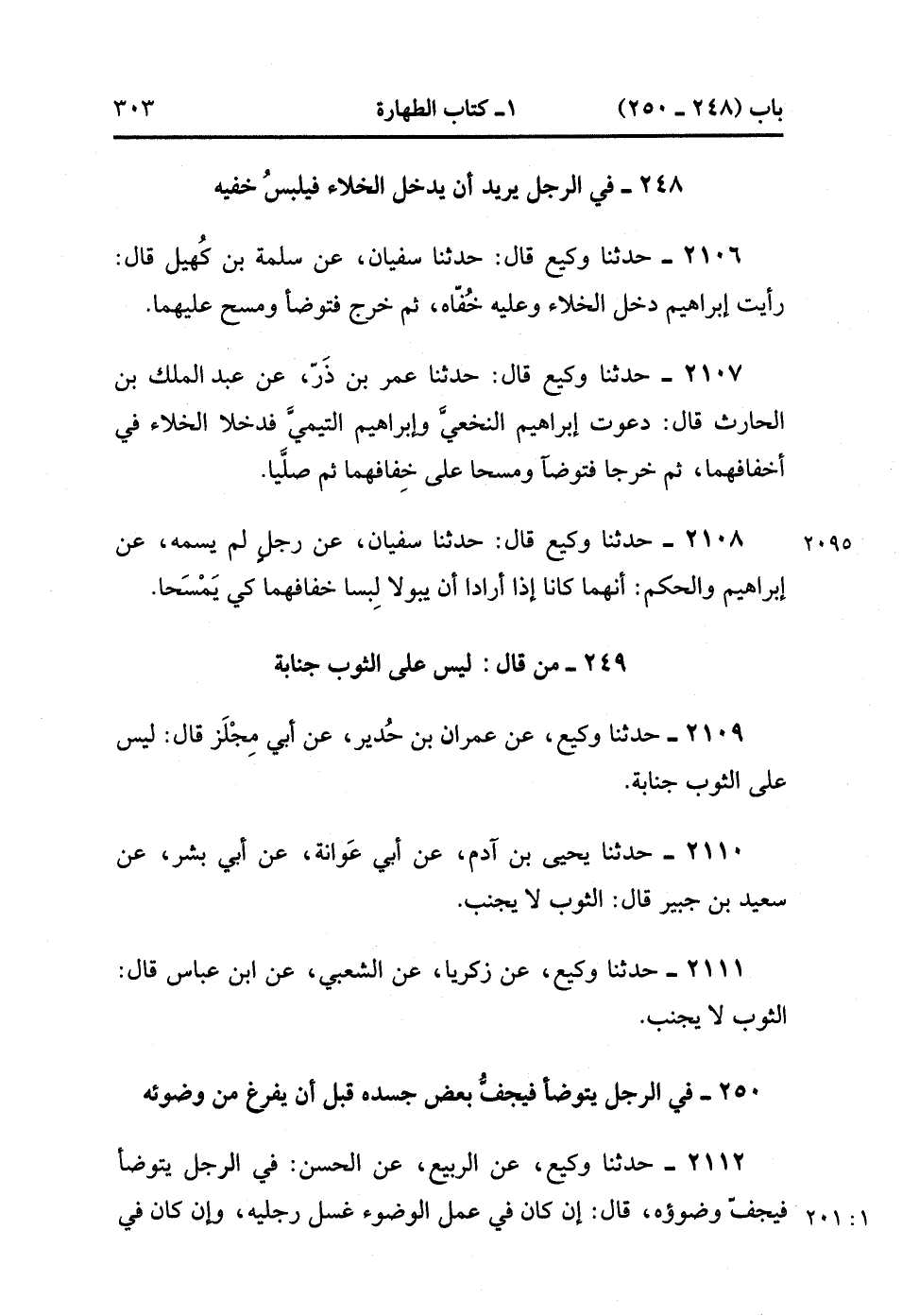 2106- حَدَّثَنَا وَكِيعٌ ، قَالَ : حَدَّثَنَا سُفْيَانُ ، عَنْ سَلَمَةَ بْنِ كُهَيْلٍ ، قَالَ : رَأَيْتُ إِبْرَاهِيمَ دَخَلَ الْخَلاَءَ وَعَلَيْهِ خُفَّاهُ ، ثُمَّ خَرَجَ فَتَوَضَّأَ وَمَسَحَ عَلَيْهِمَا.