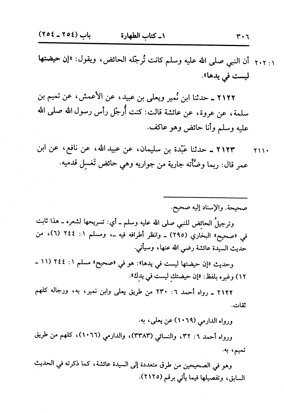 2123- حَدَّثَنَا عَبْدَةُ بْنُ سُلَيْمَانَ ، عَنْ عُبَيْدِ اللهِ ، عَنْ نَافِعٍ ، عَنِ ابْنِ عُمَرَ ، قَالَ : رُبَّمَا وَضَّأَتْهُ جَارِيَةٌ مِنْ جَوَارِيهِ وَهِيَ حَائِضٌ تَغْسِلُ قَدَمَيْهِ. (1/202).