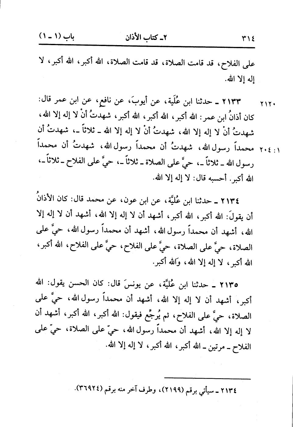 2133- حَدَّثَنَا ابْنُ عُلَيَّةَ ، عَنْ أَيُّوبَ ، عَنْ نَافِعٍ ، عَنِ ابْنِ عُمَرَ ، قَالَ : كَانَ أَذَانُ ابْنِ عُمَرَ ، اللَّهُ أَكْبَرُ ، اللَّهُ أَكْبَرُ ، اللَّهُ أَكْبَرُ ، شَهِدْتُ أَنْ لا إِلَهَ إِلاَّ اللَّهُ ، شَهِدْتُ أَنْ لا إِلَهَ إِلاَّ اللَّهُ ، شَهِدْتُ أَنْ لا إِلَهَ إِلاَّ اللَّهُ - ثَلاَثًا - شَهِدْتُ أَنَّ مُحَمَّدًا رَسُولُ اللهِ ، شَهِدْتُ أَنَّ مُحَمَّدًا رَسُولُ اللهِ ، شَهِدْتُ أَنَّ مُحَمَّدًا رَسُولُ اللهِ - ثَلاَثًا - حَيَّ عَلَى الصَّلاةِ - ثَلاَثًا - حَيَّ عَلَى الْفَلاَحِ - ثَلاَثًا - اللَّهُ أَكْبَرُ ، أَحْسِبُهُ قَالَ : لا إِلَهَ إِلاَّ اللَّهُ. (1/203)