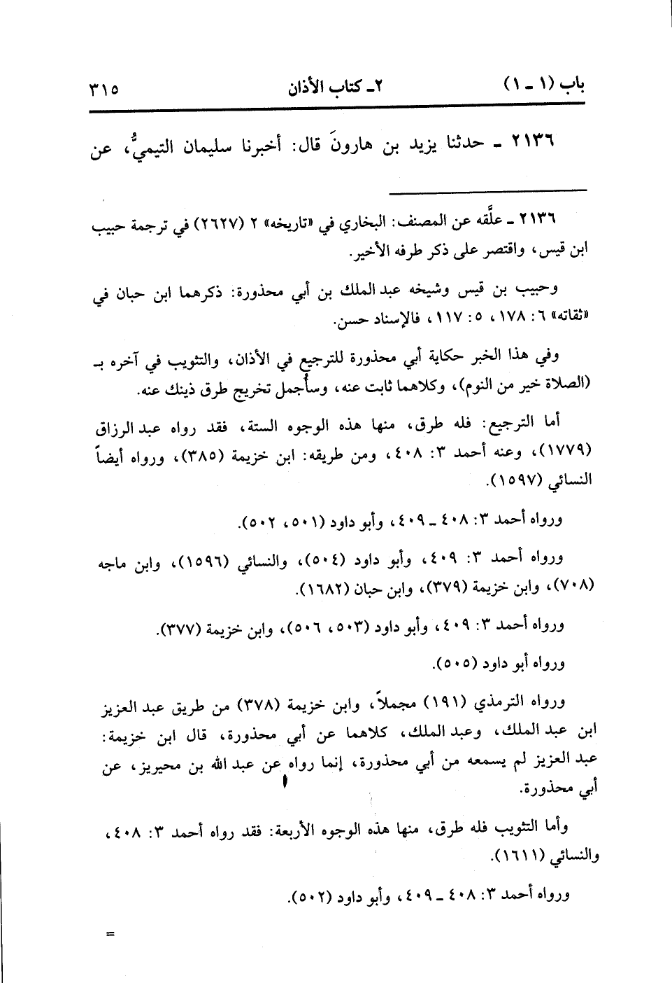 2136- حَدَّثَنَا يَزِيدُ بْنُ هَارُونَ ، قَالَ : أَخبرنَا سُلَيْمَانُ التَّيْمِيُّ ، عَنْ حَبِيبِ بْنِ قَيْسٍ ، عَنِ ابْنِ أَبِي مَحْذُورَةَ ، عَنْ أَبِيهِ ، أَنَّهُ كَانَ يَخْفِضُ صَوْتَهُ بِالأَذَانِ مَرَّةً مَرَّةً ، حَتَّى إِذَا انْتَهَى إِلَى قَوْلِهِ : أَشْهَدُ أَنَّ مُحَمَّدًا رَسُولُ اللهِ ، أَشْهَدُ أَنَّ مُحَمَّدًا رَسُولُ اللهِ ، رَجَعَ إِلَى قَوْلِهِ : أَشْهَدُ أَنْ لا إِلَهَ إِلاَّ اللَّهُ ، فَرَفَعَ بِهَا صَوْتَهُ مَرَّتَيْنِ مَرَّتَيْنِ ، حَتَّى إِذَا انْتَهَى إِلَى : حَيَّ عَلَى الصَّلاَةِ ، قَالَ : الصَّلاَةُ خَيْرٌ مِنَ النَّوْمِ ، فِي الأَذَانِ الأَوَّلِ مِنَ الْفَجْرِ. (1/204).