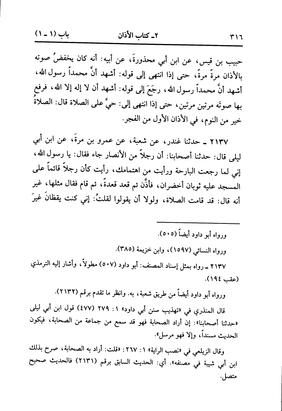 2137- حَدَّثَنَا غُنْدَرٌ ، عَنْ شُعْبَةَ ، عَنْ عَمْرو بْنِ مُرَّةَ ، عَنِ ابْنِ أَبِي لَيْلَى ، قَالَ : حَدَّثَنَا أَصْحَابُنَا ؛ أَنَّ رَجُلاً مِنَ الأَنْصَارِ جَاءَ فَقَالَ : يَا رَسُولَ اللهِ ، إِنِّي لَمَّا رَجَعْتُ الْبَارِحَةَ وَرَأَيْتُ مِنَ اهْتِمَامِكَ ، رَأَيْتُ كَأَنَّ رَجُلاً قَائِمًا عَلَى الْمَسْجِدِ عَلَيْهِ ثَوْبَانِ أَخْضَرَانِ فَأَذَّنَ ثُمَّ قَعَدَ قَعْدَةً ثُمَّ قَامَ فَقَالَ مِثْلَهَا ، غَيْرَ أَنَّهُ قَالَ : قَدْ قَامَتِ الصَّلاَةُ ، وَلَوْلاَ أَنْ يَقُولُوا لَقُلْتُ : إِنِّي كُنْتُ يَقْظَانًا غَيْرَ نَائِمٍ ، فَقَالَ النَّبِيُّ صَلَّى اللَّهُ عَلَيْهِ وَسَلَّمَ : لَقَدْ أَرَاكَ اللَّهُ خَيْرًا ، فَقَالَ عُمَرُ : أَمَا إِنِّي قَدْ رَأَيْتُ مِثْلَ الَّذِي رَأَى ، غَيْرَ أَنِّي لَمَّا سُبِقْتُ اسْتَحْيَيْتُ ، فَقَالَ النَّبِيُّ صَلَّى اللَّهُ عَلَيْهِ وَسَلَّمَ : مُرُوا بِلاَلاً فَلْيُؤَذِّنْ. (1/204).