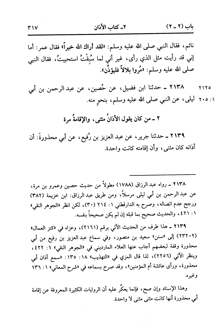2139- حَدَّثَنَا جَرِيرٌ ، عَنْ عَبْدِ الْعَزِيزِ بْنِ رُفَيْعٍ ، عَنْ أَبِي مَحْذُورَةَ : أَنَّ أَذَانَهُ كَانَ مَثْنَى ، وَأَنَّ إِقَامَتَهُ كَانَتْ وَاحِدَةً. (1/205).