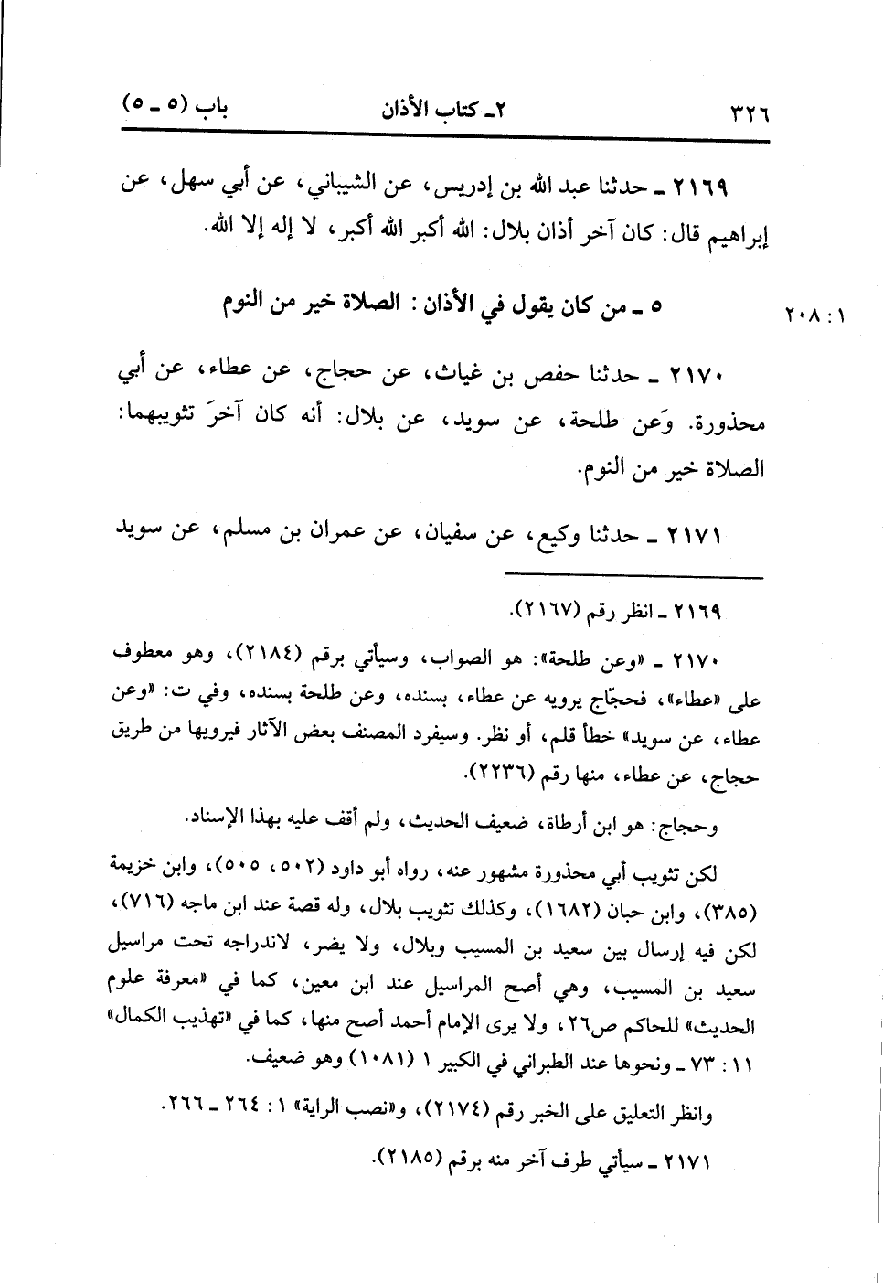 2170- حَدَّثَنَا حَفْصُ بْنُ غِيَاثٍ ، عَنْ حَجَّاجٍ ، عَنْ عَطَاءٍ ، عَنْ أَبِي مَحْذُورَةَ (ح) وَعَنْ طَلْحَةَ ، عَنْ سُوَيْدٍ ، عَنْ بِلاَلٍ : أَنَّهُ كَانَ آخِرُ تَثْوِيبِهِمَا : الصَّلاَةُ خَيْرٌ مِنَ النَّوْمِ.