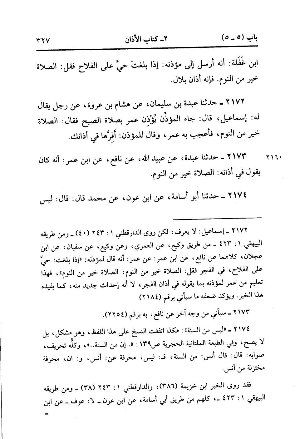 2172- حَدَّثَنَا عَبْدَةُ بْنُ سُلَيْمَانَ ، عَنْ هِشَامِ بْنِ عُرْوَةَ ، عَنْ رَجُلٍ يُقَالُ لَهُ : إِسْمَاعِيلُ ، قَالَ : جَاءَ الْمُؤَذِّنُ يُؤْذِن عُمَرَ بِصَلاَةِ الصُّبْحِ ، فَقَالَ : الصَّلاَةُ خَيْرٌ مِنَ النَّوْمِ ، فَأُعْجِبَ بِهِ عُمَرُ ، وَقَالَ لِلْمُؤَذِّنِ : أَقِرَّهَا فِي أَذَانِكَ.