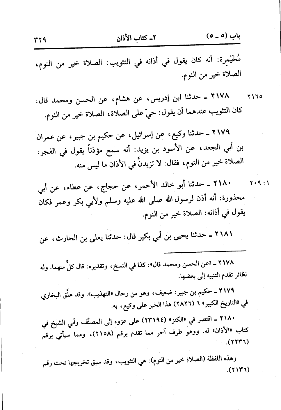 2178- حَدَّثَنَا ابْنُ إِدْرِيسَ ، عَنْ هِشَامٍ ، عَنِ الْحَسَنِ وَمُحَمَّدٍ ، قَالَ : كَانَ التَّثْوِيبُ عِنْدَهُمَا أَنْ يَقُولَ : حَيَّ عَلَى الصَّلاَةِ ، الصَّلاَةُ خَيْرٌ مِنَ النَّوْمِ.