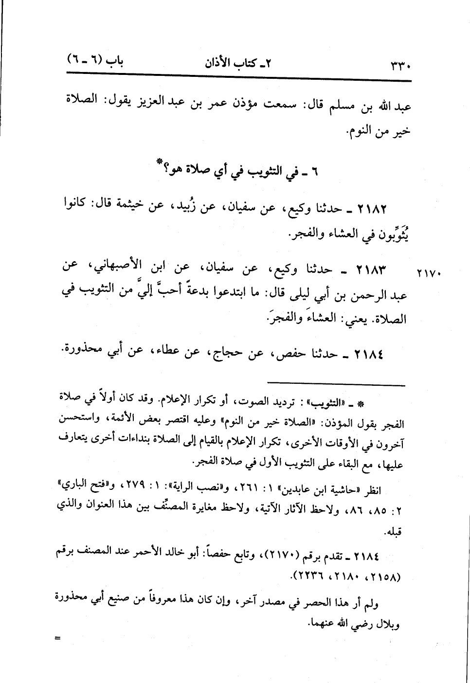 2183- حَدَّثَنَا وَكِيعٌ ، عَنْ سُفْيَانَ ، عَنِ ابْنِ الأَصْبَهَانِيِّ ، عَنْ عَبْدِ الرَّحْمَنِ بْنِ أَبِي لَيْلَى ، قَالَ : مَا ابْتَدَعُوا بِدْعَةً أَحَبَّ إِلَيَّ مِنَ التَّثْوِيبِ فِي الصَّلاَةِ ، يَعْنِي : الْعِشَاءَ وَالْفَجْرَ.