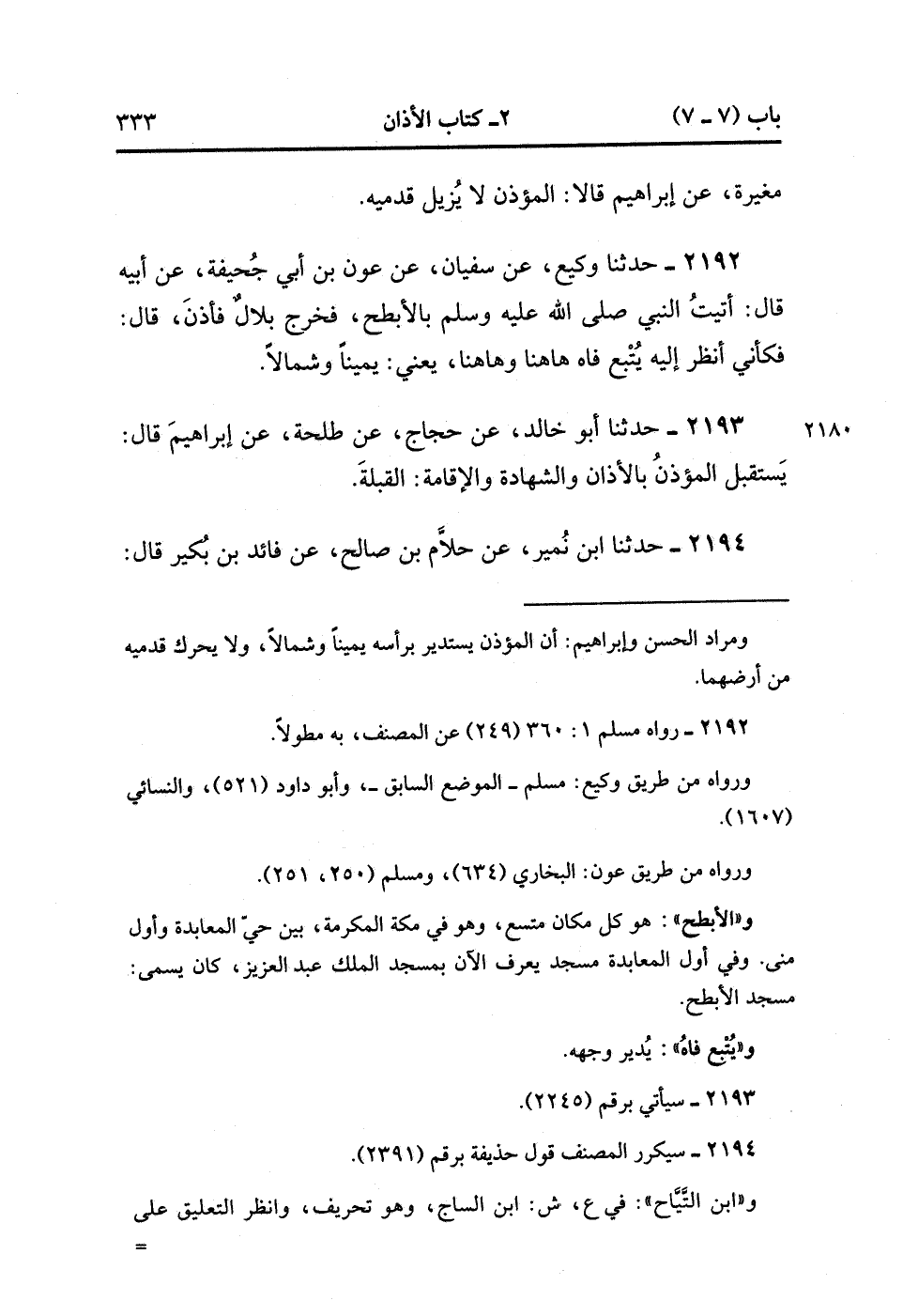 2192- حَدَّثَنَا وَكِيعٌ ، عَنْ سُفْيَانَ ، عَنْ عَوْنِ بْنِ أَبِي جُحَيْفَةَ ، عَنْ أَبِيهِ ، قَالَ : أَتَيْتُ النَّبِيَّ صَلَّى اللَّهُ عَلَيْهِ وَسَلَّمَ بِالأَبْطَحِ ، فَخَرَجَ بِلاَلٌ فَأَذَّنَ ، قَالَ : فَكَأَنِّي أَنْظُرُ إِلَيْهِ يتبع فَاهُ هَاهُنَا وَهَاهُنَا ، يَعْنِي : يَمِينًا وَشِمَالاً.
