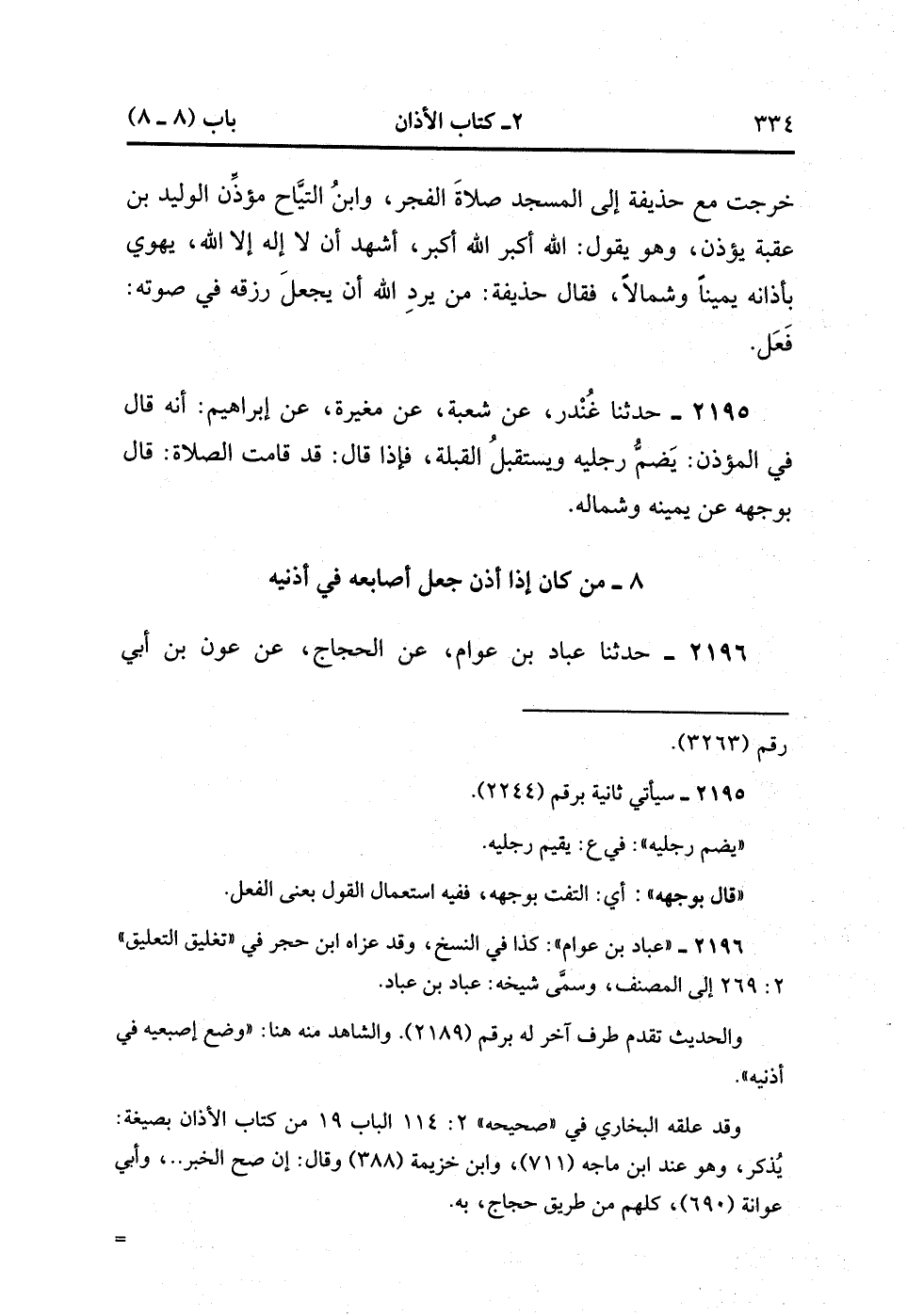2196- حَدَّثَنَا عَبَّادُ بْنُ عَوَّامٍ ، عَنِ الحَجَّاجٍ ، عَنْ عَوْنِ بْنِ أَبِي جُحَيْفَةَ ، عَنْ أَبِيهِ : أَنَّ بِلاَلاً رَكَزَ الْعَنَزَةَ ثُمَّ أَذَّنَ وَوَضَعَ إِصْبَعَيْهِ فِي أُذُنَيْهِ. (1/210).