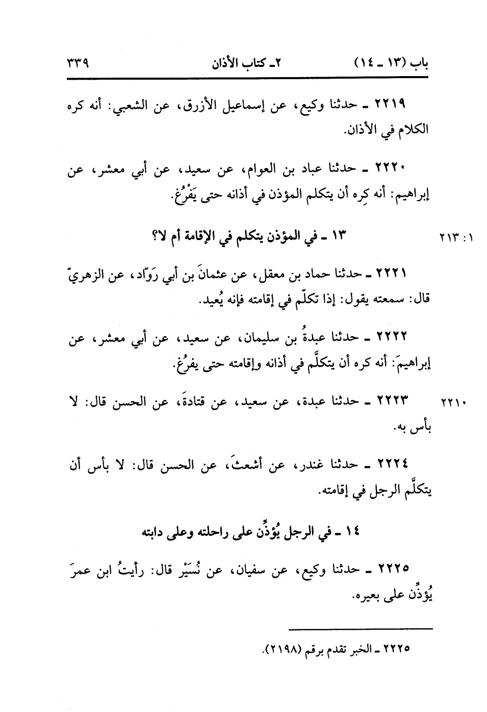 2219- حَدَّثَنَا وَكِيعٌ ، عَنْ إِسْمَاعِيلَ الأَزْرَقِ ، عَنِ الشَّعْبِيِّ : أَنَّهُ كَرِهَ الْكَلاَمَ فِي الأَذَانِ.