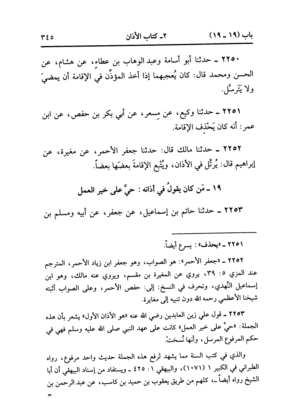 2252- حَدَّثَنَا مَالِكٌ ، قَالَ : حَدَّثَنَا جعفر الأَحْمَرُ ، عَنْ مُغِيرَةَ ، عَنْ إِبْرَاهِيمَ ، قَالَ : يُرَتِّلُ فِي الأَذَانَ ، وَيُتْبَعُ الإِقَامَةَ بَعْضَهَا بَعْضاً. (1/215).