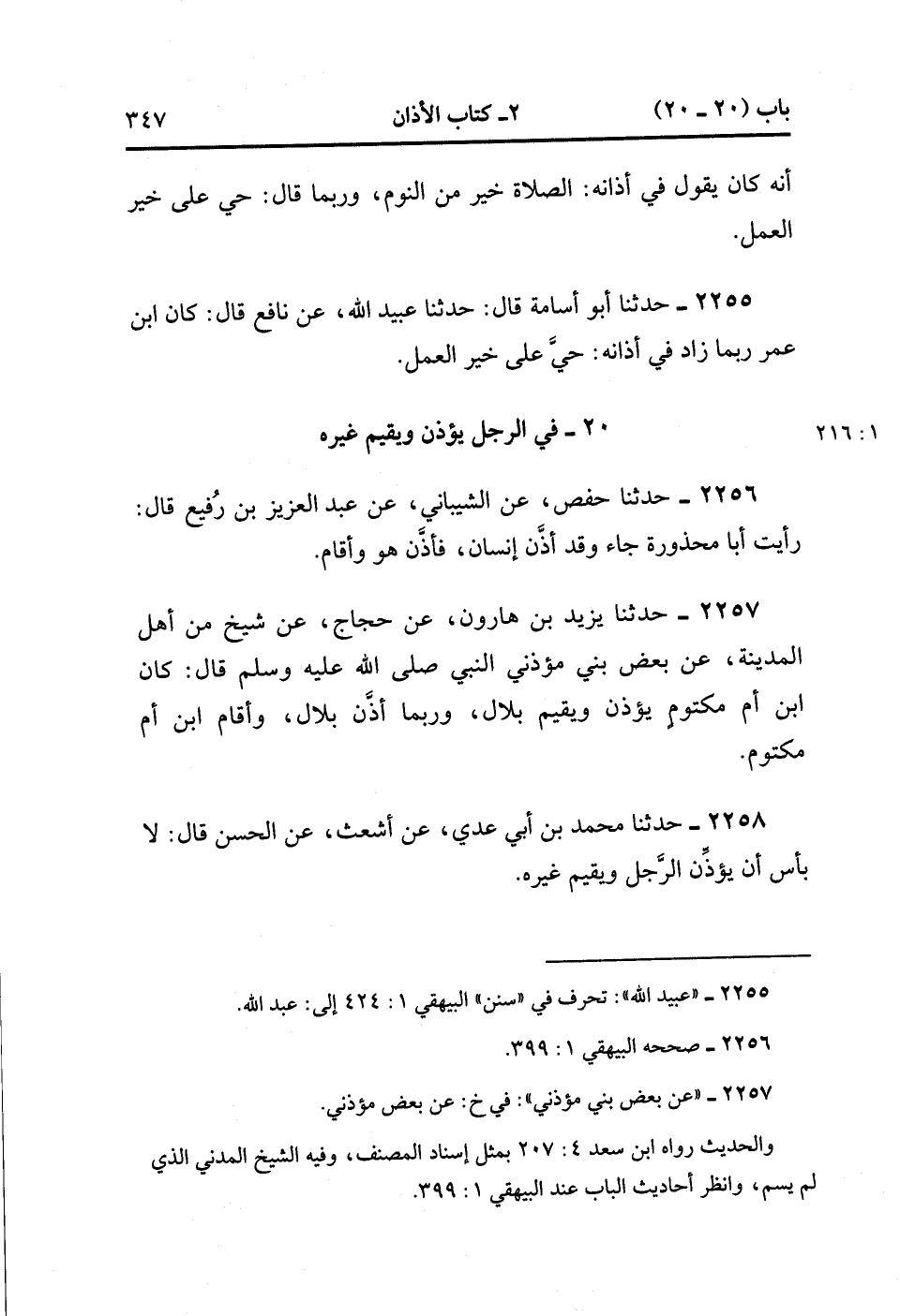 2255- حَدَّثَنَا أَبُو أُسَامَةَ ، قَالَ : حَدَّثَنَا عُبَيْدُ اللهِ ، عَنْ نَافِعٍ ، قَالَ : كَانَ ابْنُ عُمَرَ رُبَّمَا زَادَ فِي أَذَانِهِ : حَيَّ عَلَى خَيْرِ الْعَمَلِ. (1/215)